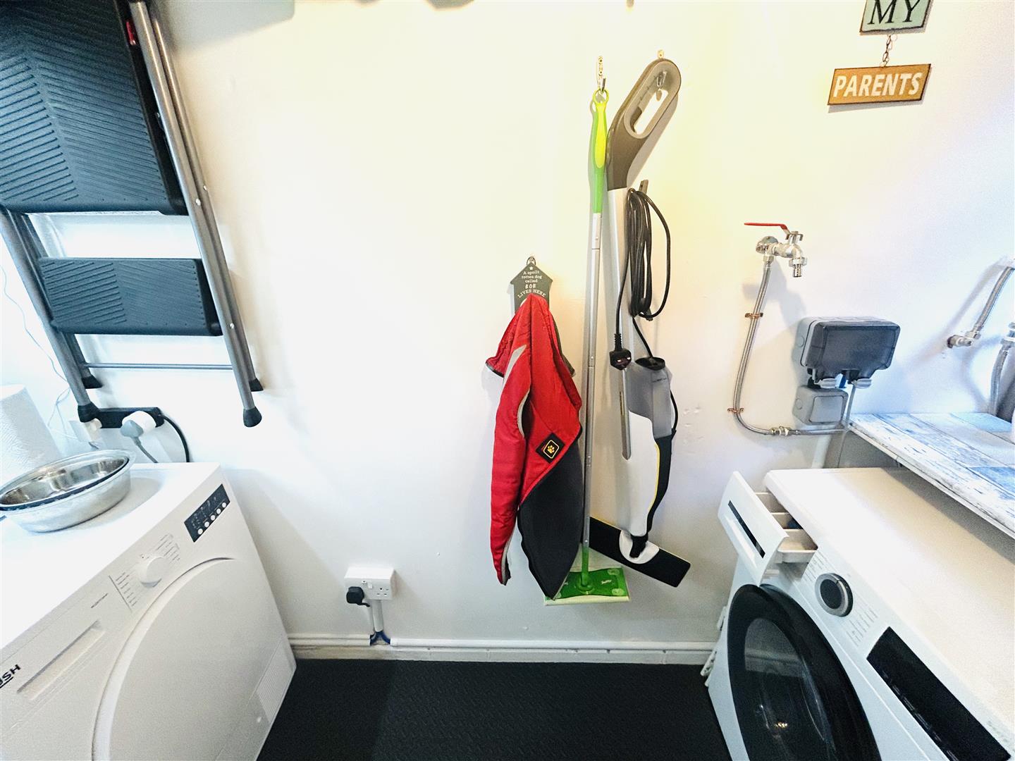 Plumbed for washing machine, space for tumble dryer.