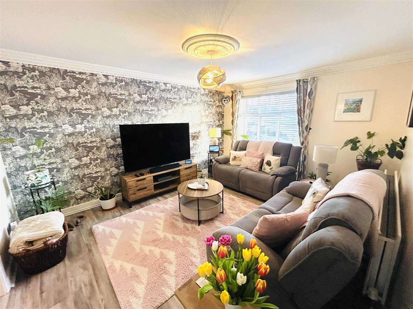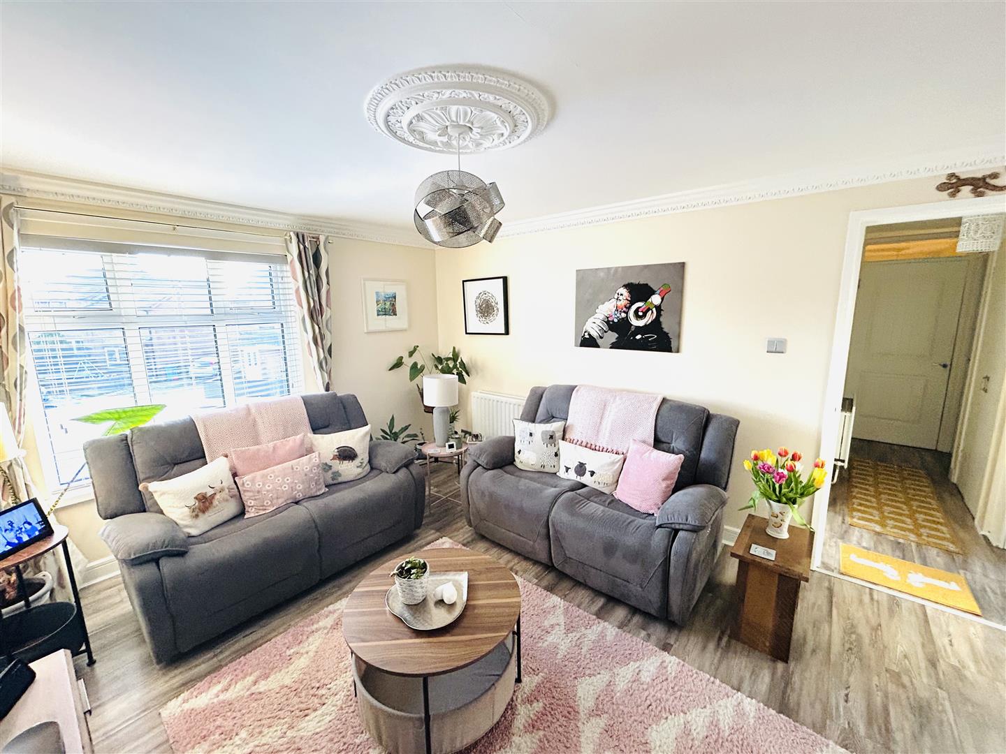 Having ceiling cornicing and laminated wooden floor.