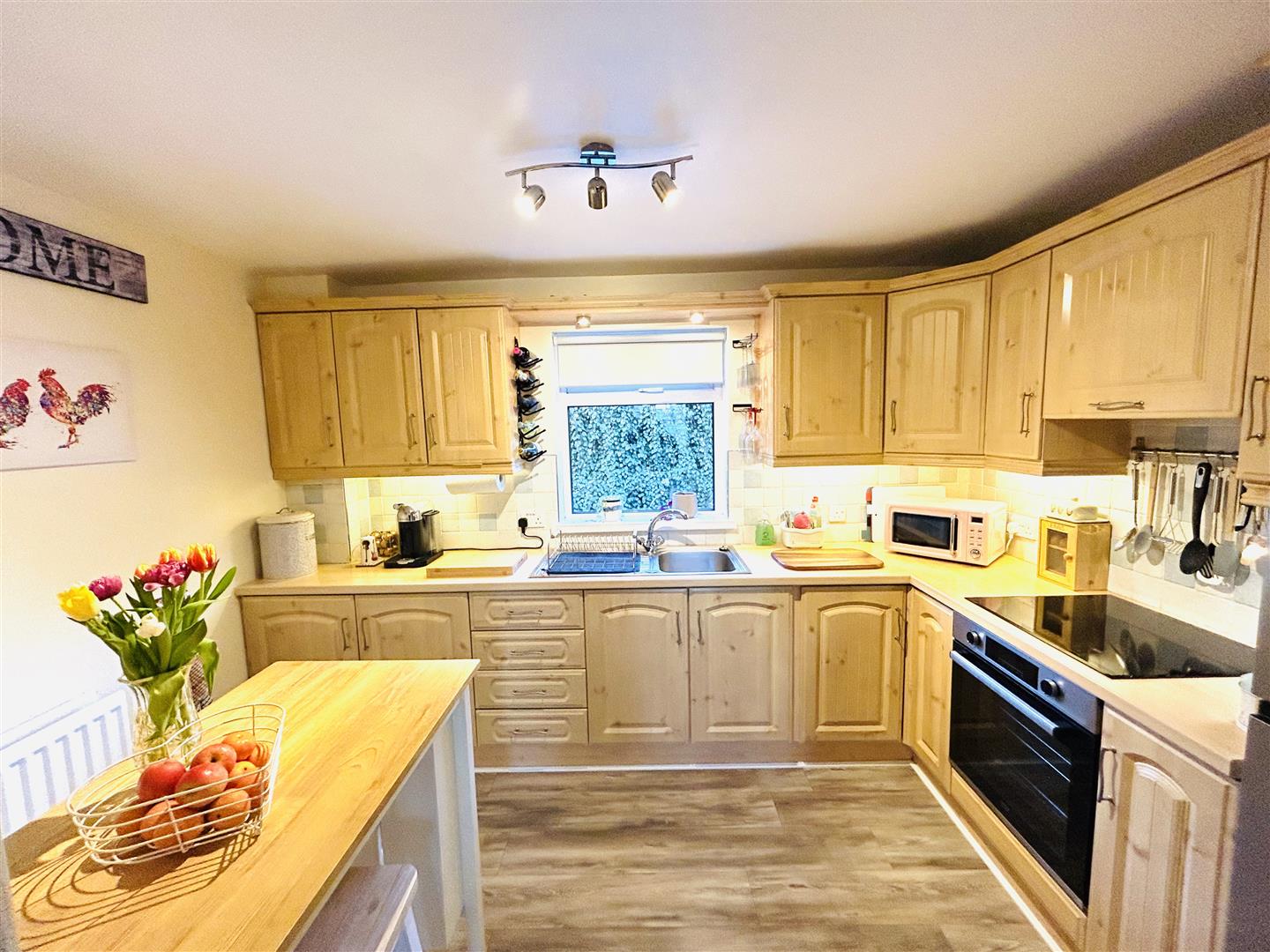 Having range of eye and low level units with concealed lighting under, tiling between units, single drainer stainless steel sink unit with mixer taps, hob, underoven, extractor hood, space for fridge / freezer, laminated wooden floor.