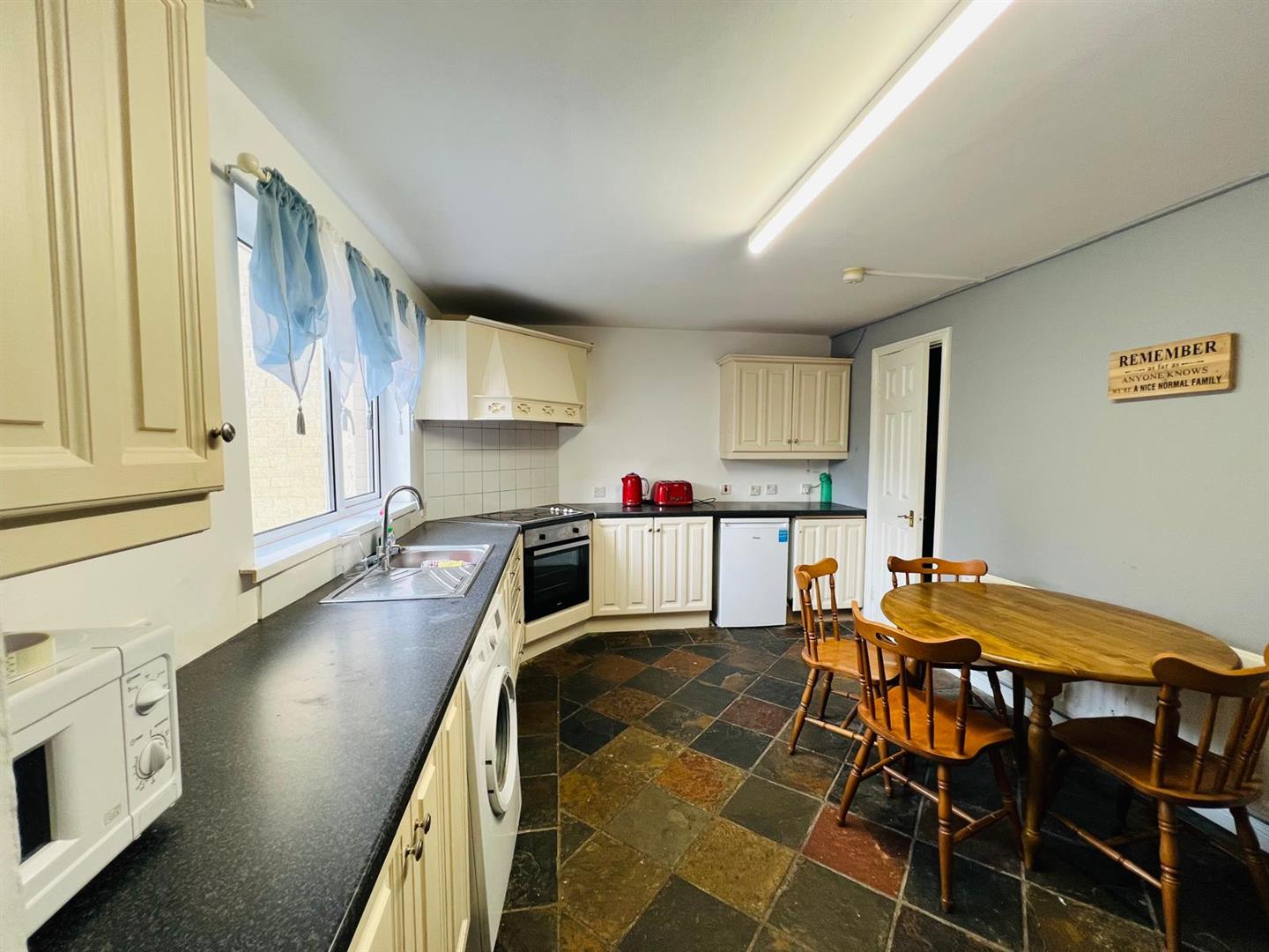 Having eye and low level units, single drainer stainless steel sink unit with mixer taps, hob and underoven, plumbed for washing machine, dining space, understairs storage, tiled floor.