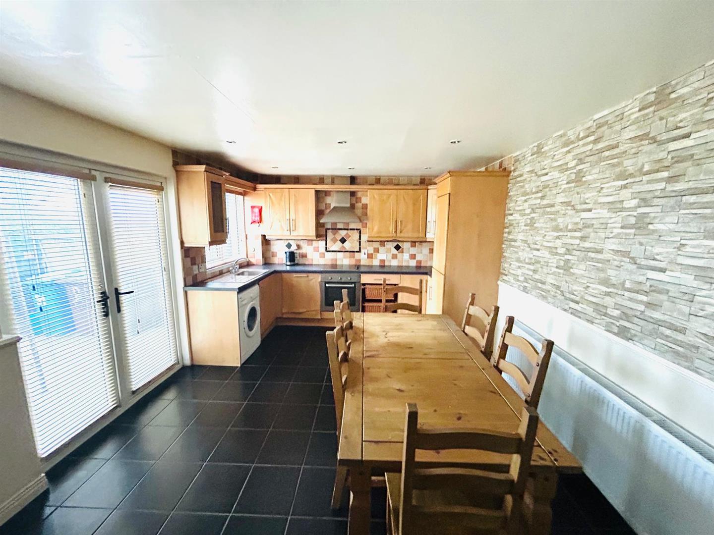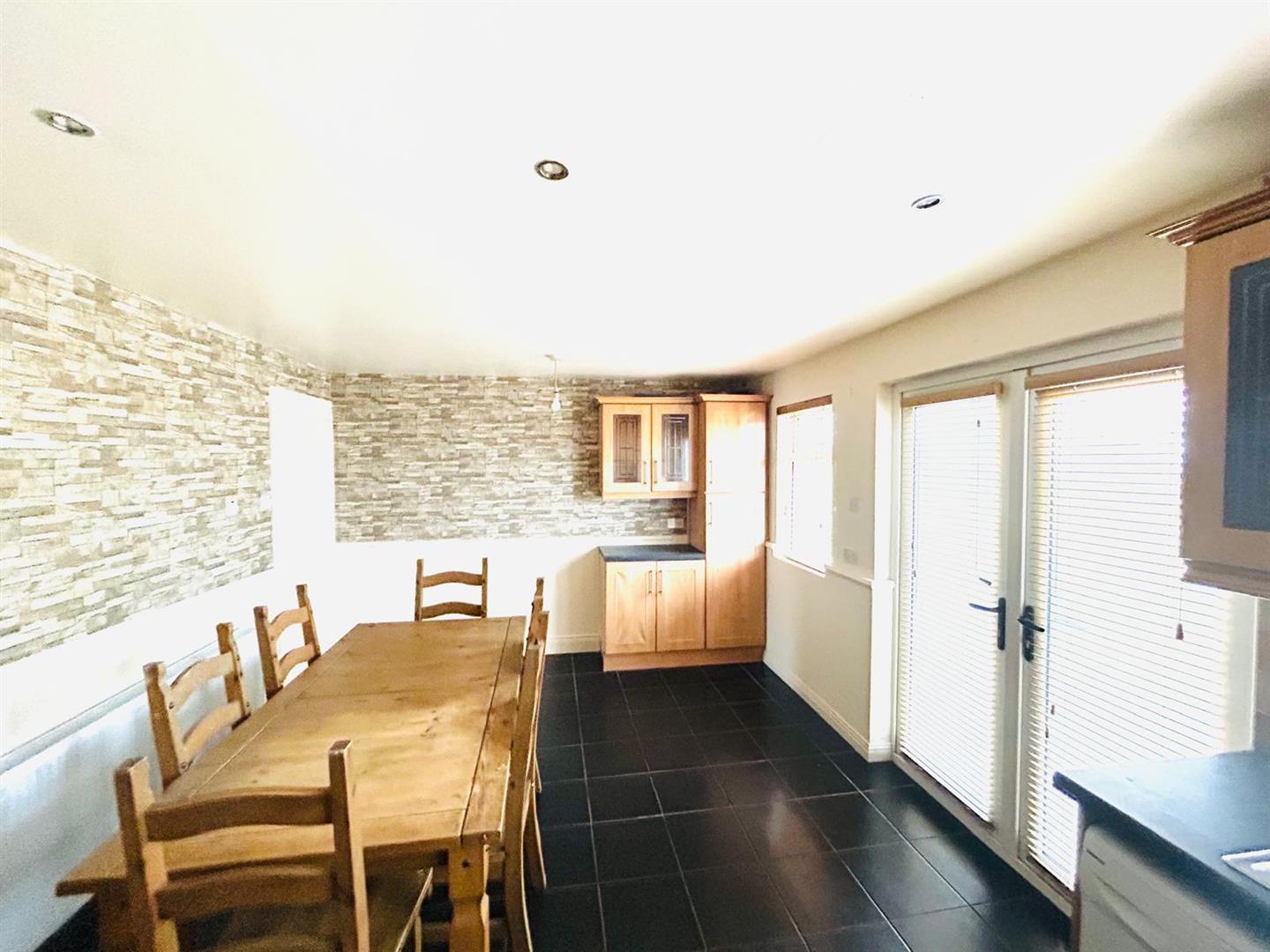 Having eye and low level units, tilling between units, single drainer stainless steel sink unit with mixer taps, integrated hob and underoven, stainless steel extractor hood, integrated fridge / freezer and dishwasher, plumbed for washing machine, tiled floor, French doors leading to rear.
