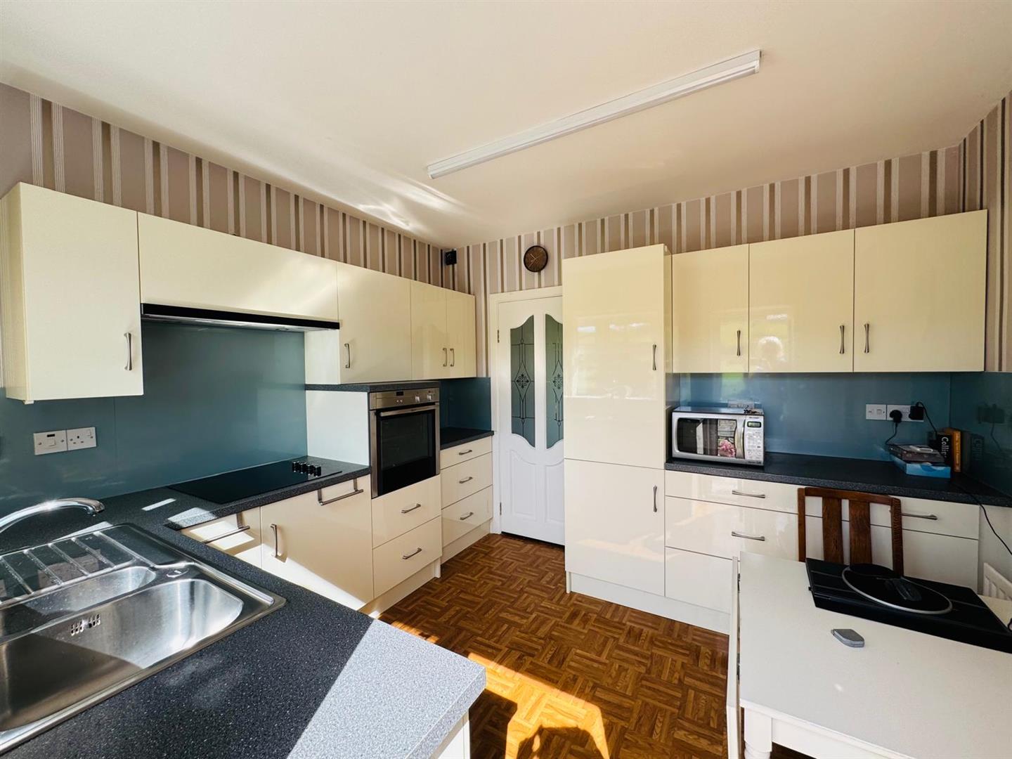 Beautifully manicured lawns to side and rear stocked with abundance of flowering plants, fruit trees and mature shrubs. Raspberry bushes, gooseberry bushes and apple trees.