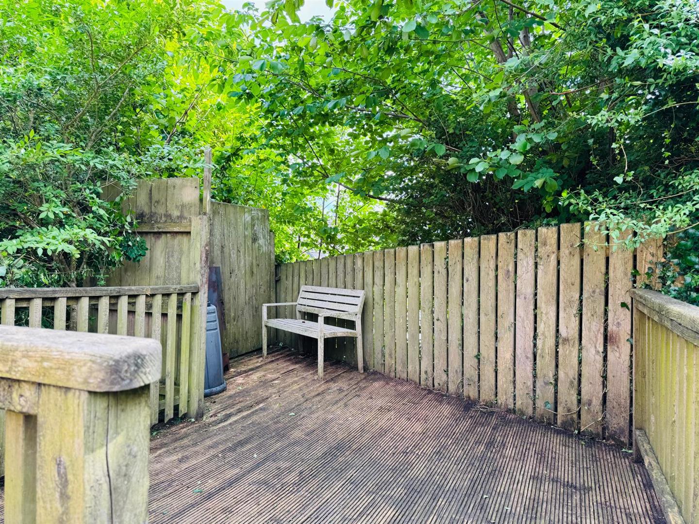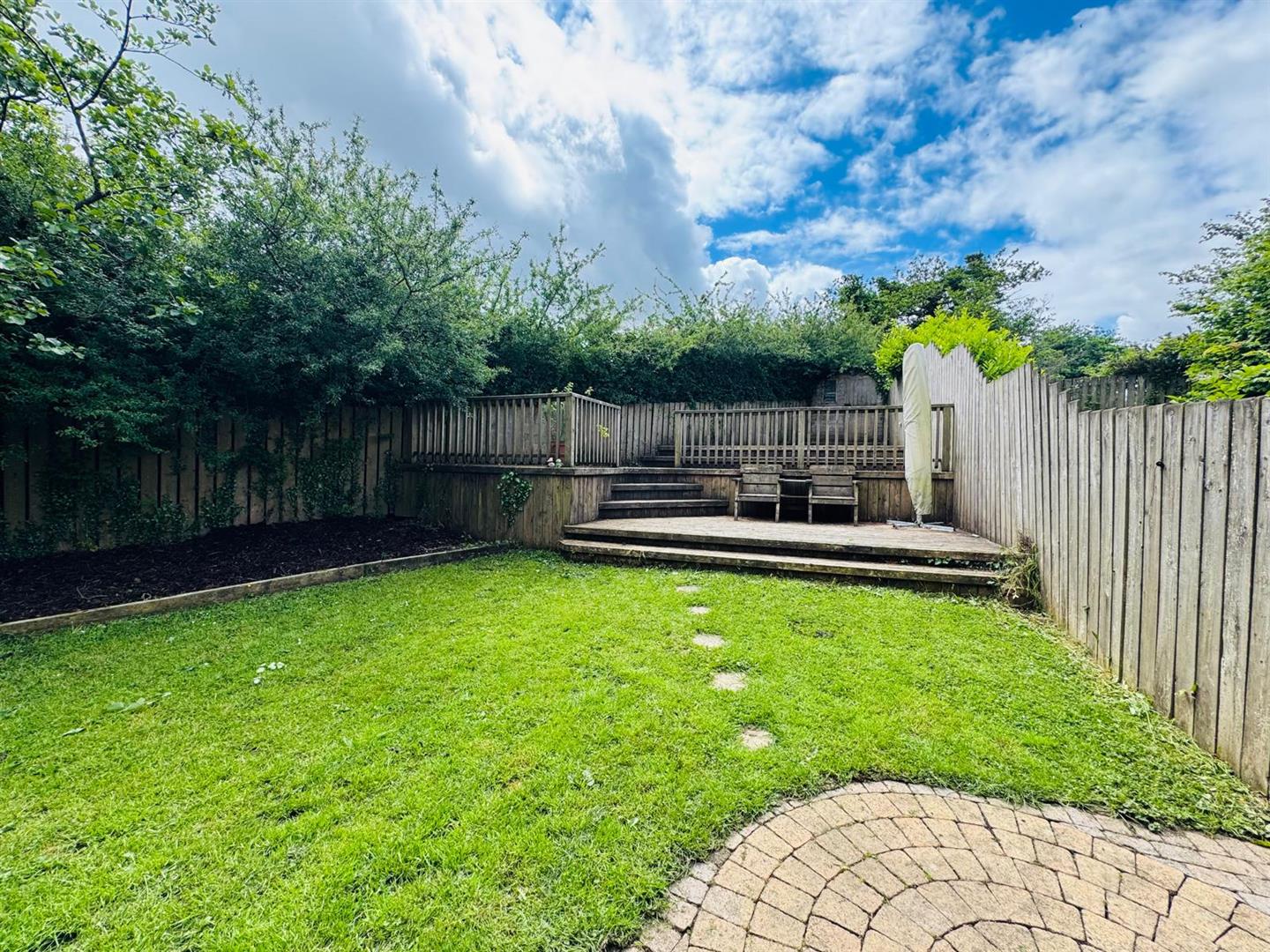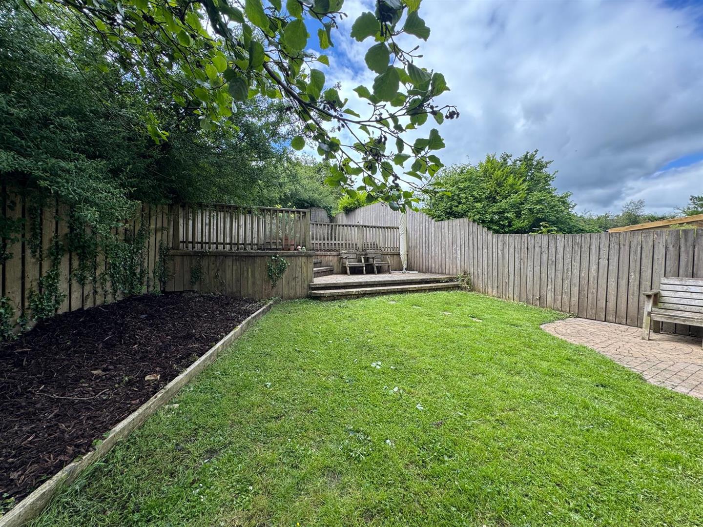 Neat lawn to rear leading to decked patio area.