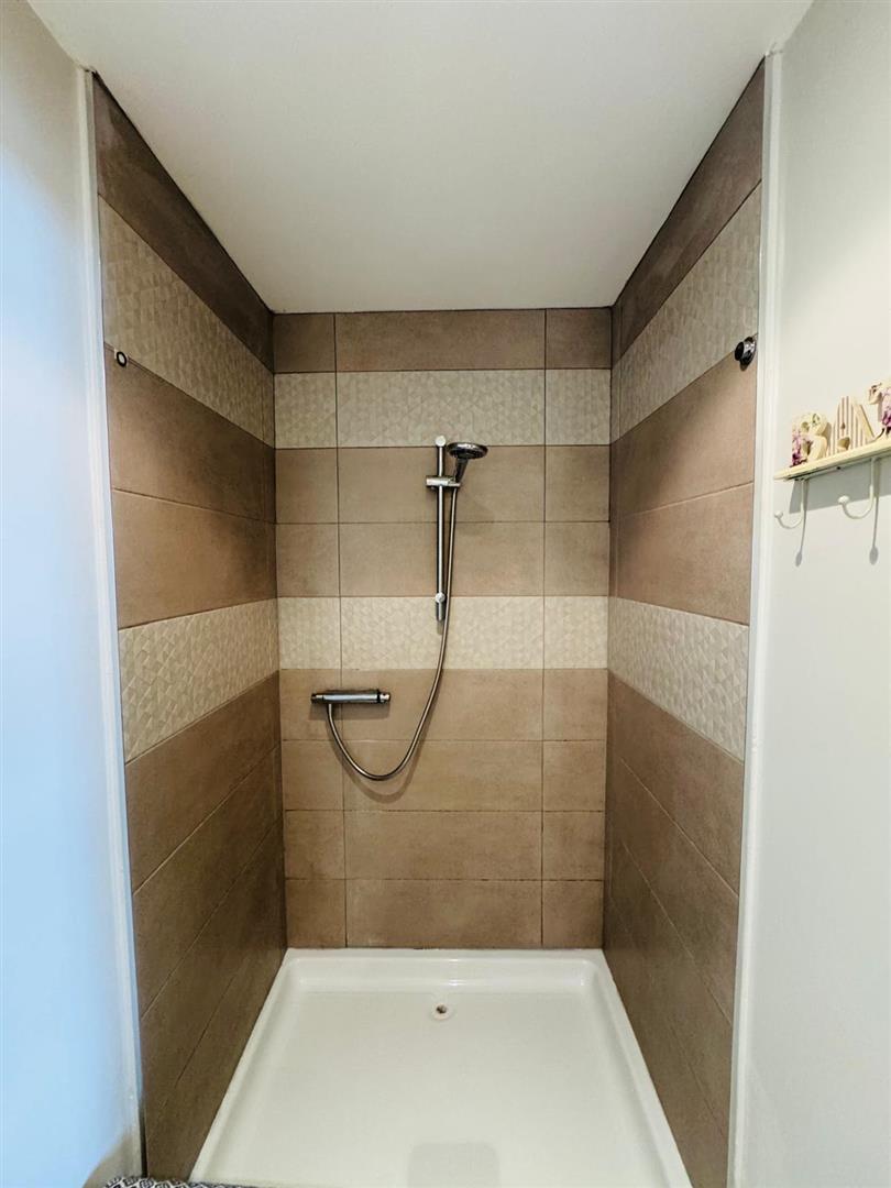 Comprising fully tiled walk in shower, whb and wc, tiled floor.