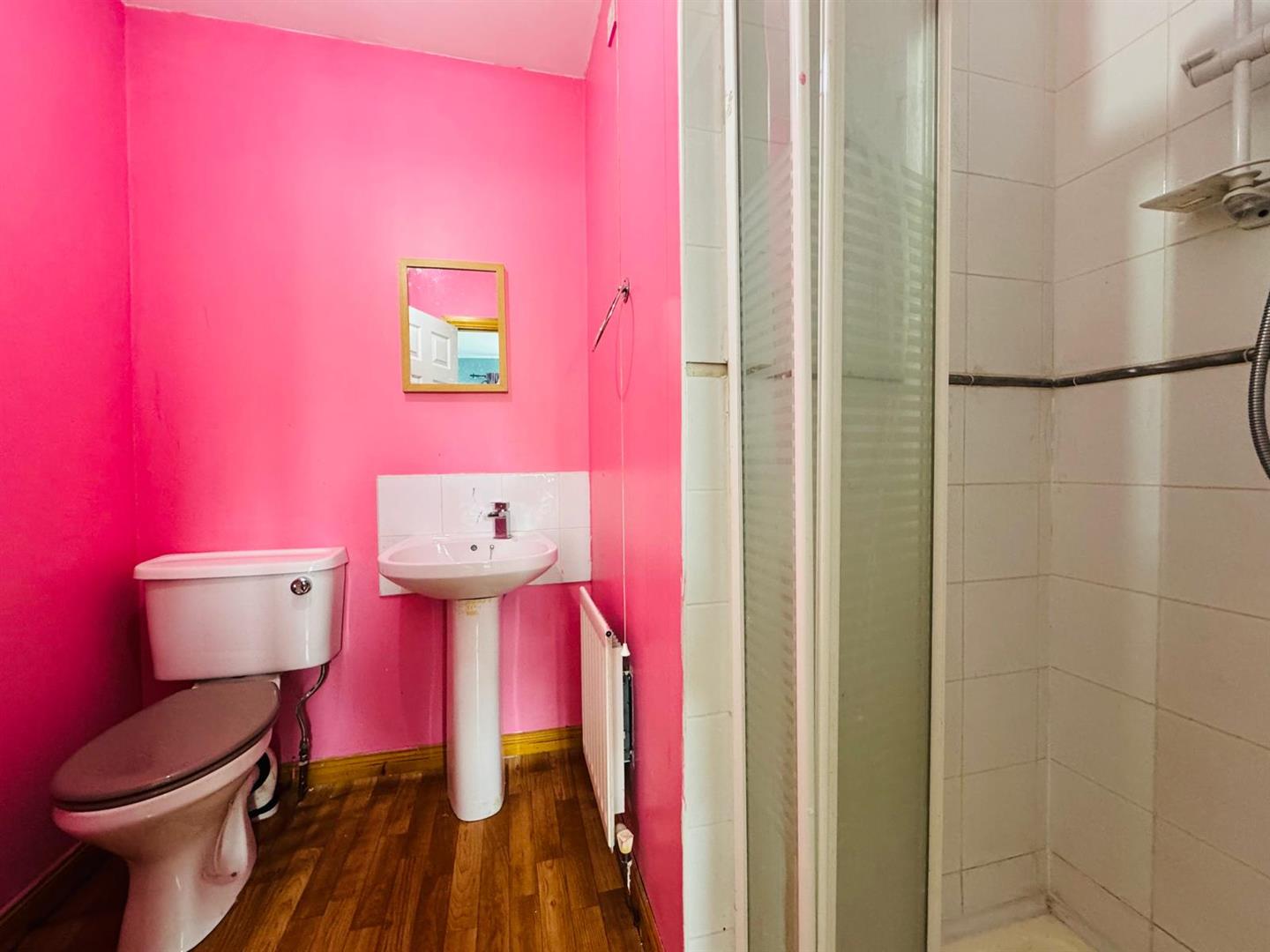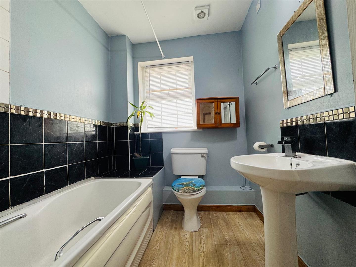 Comprising bath with tiling around, electric shower over, shower screen, whb and wc.