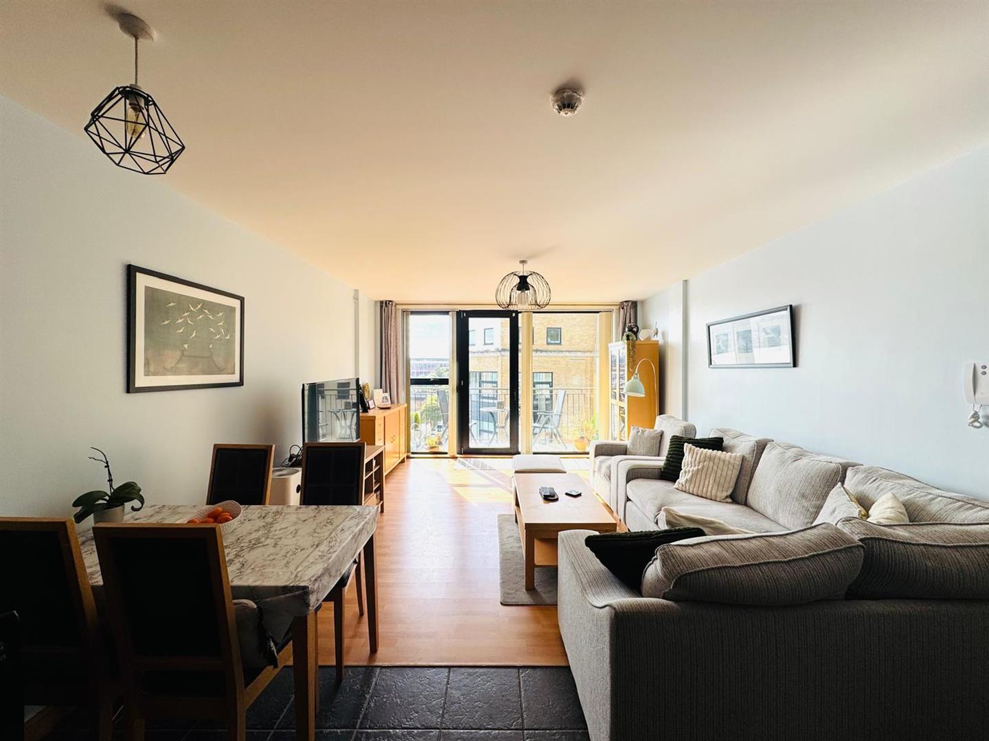 Lounge area having laminated wooden floor, door to balcony, dining space.
