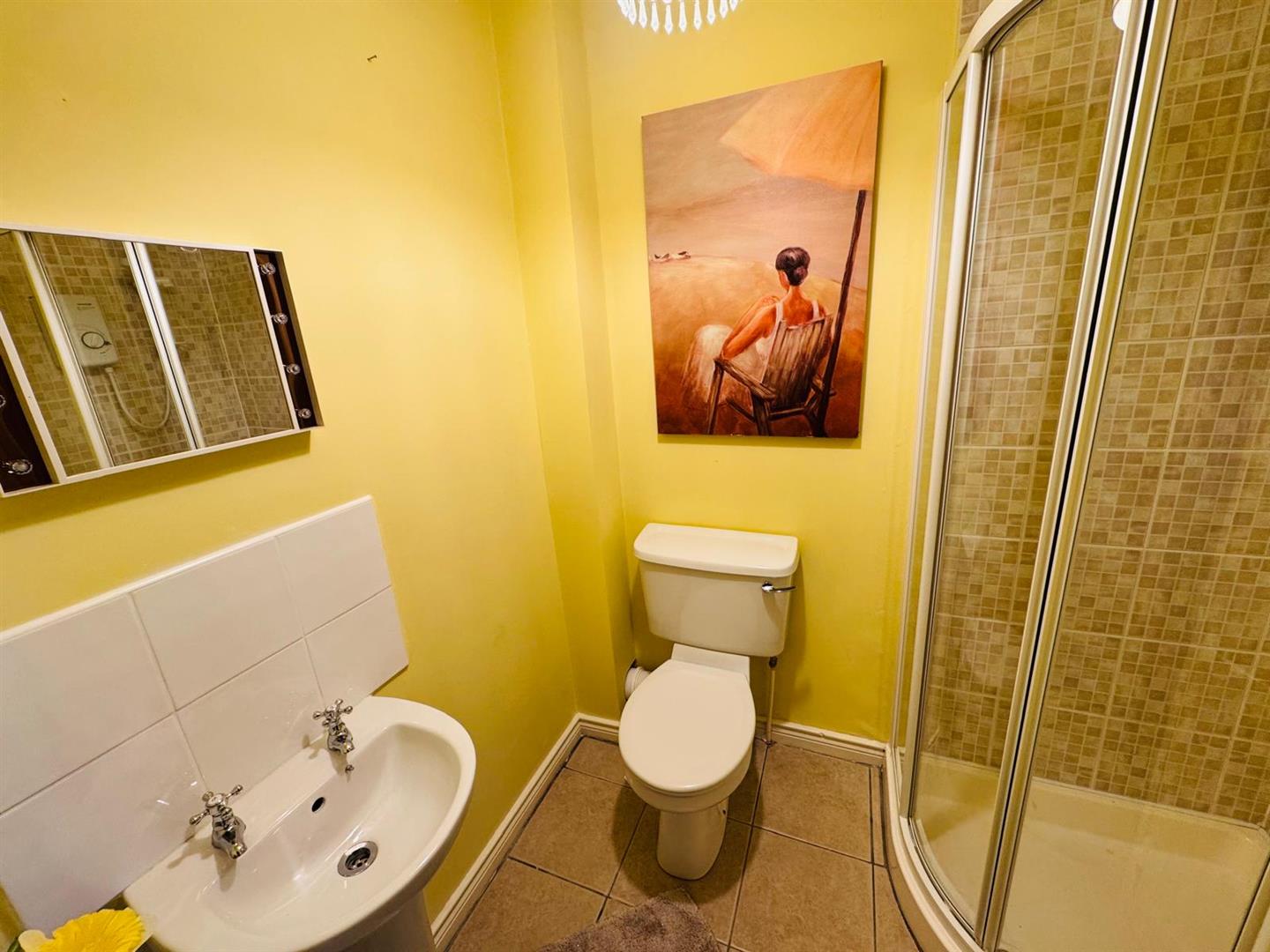 Comprising fully tiled walk in electric shower, whb and wc, tiled floor.