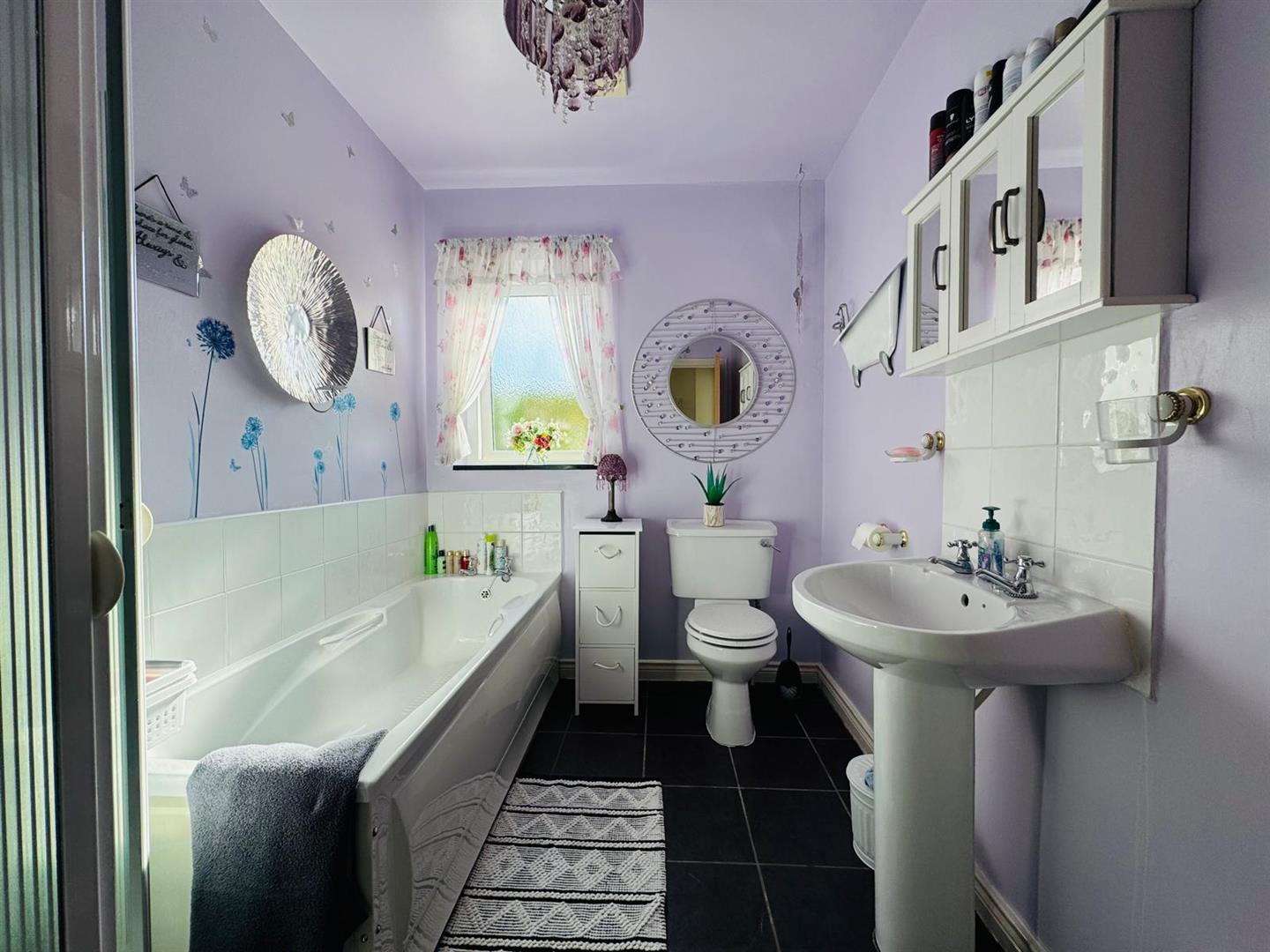 Comprising bath, whb and wc, walk in shower with PVC cladding to walls, tiled floor.