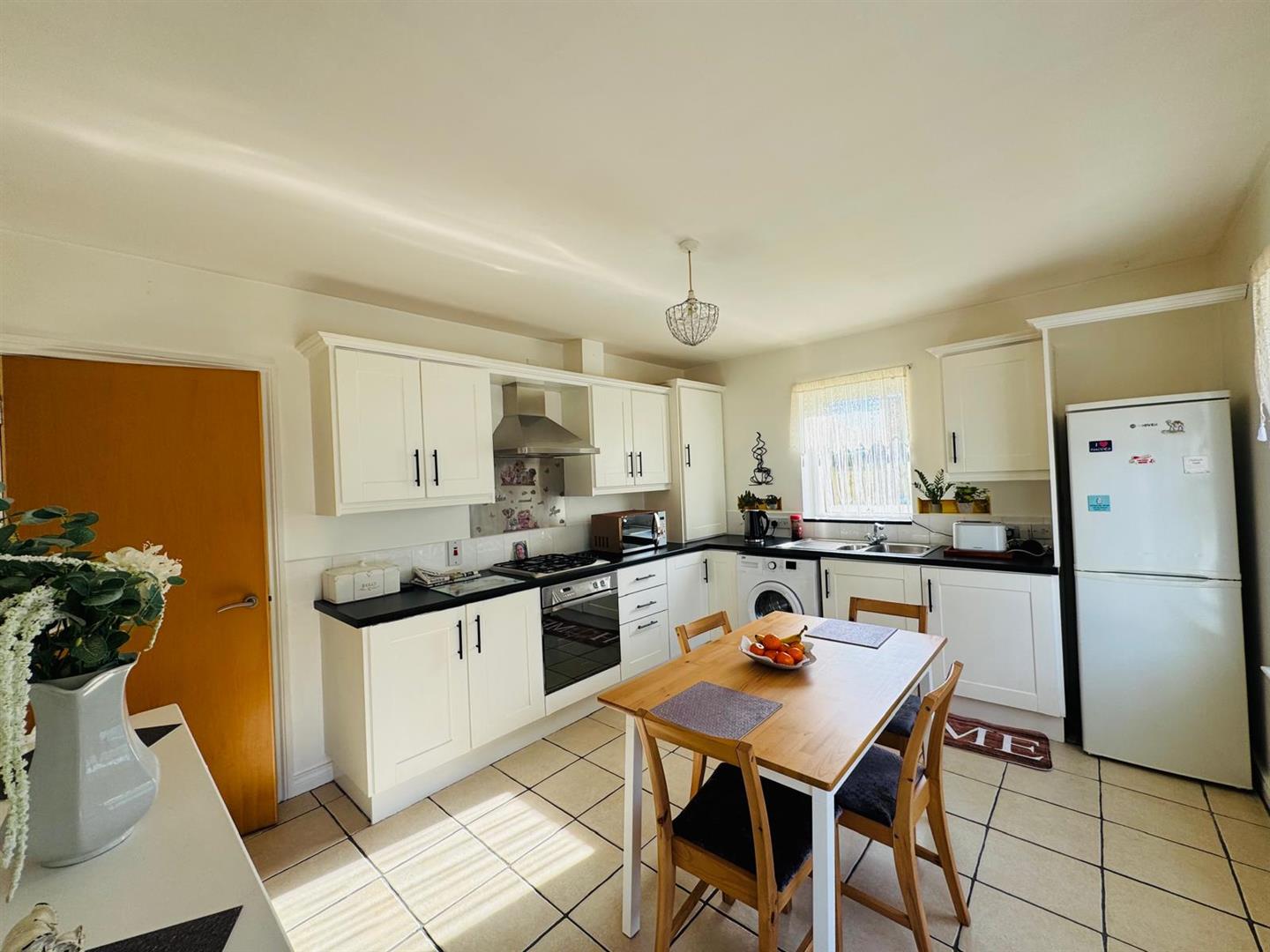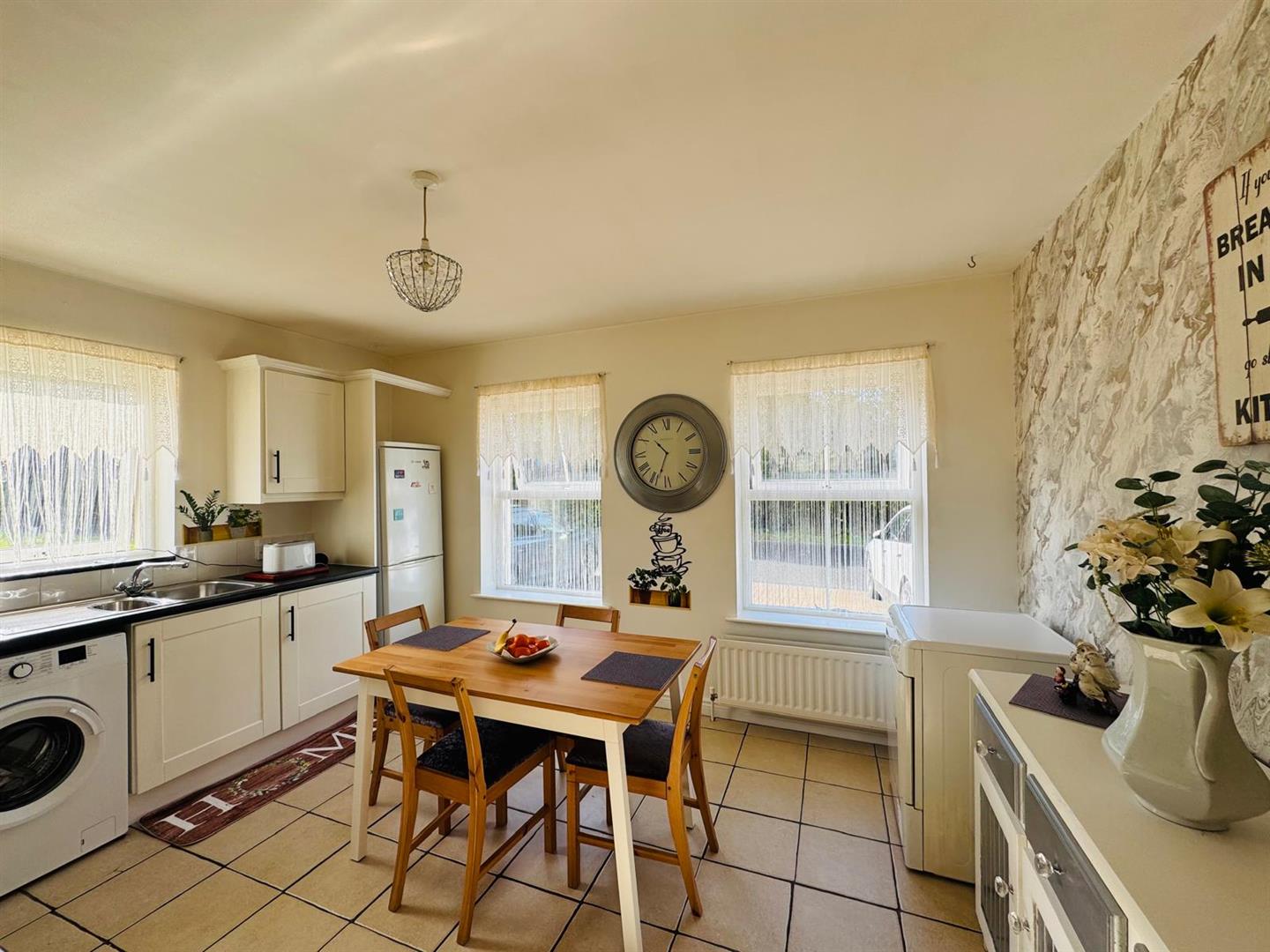 Having range of eye and low level units, 11/2 bowl stainless steel sink unit with mixer taps, gas hob, electric underoven, plumbed for washing machine, space for fridge/freezer, dining space, tiled floor.