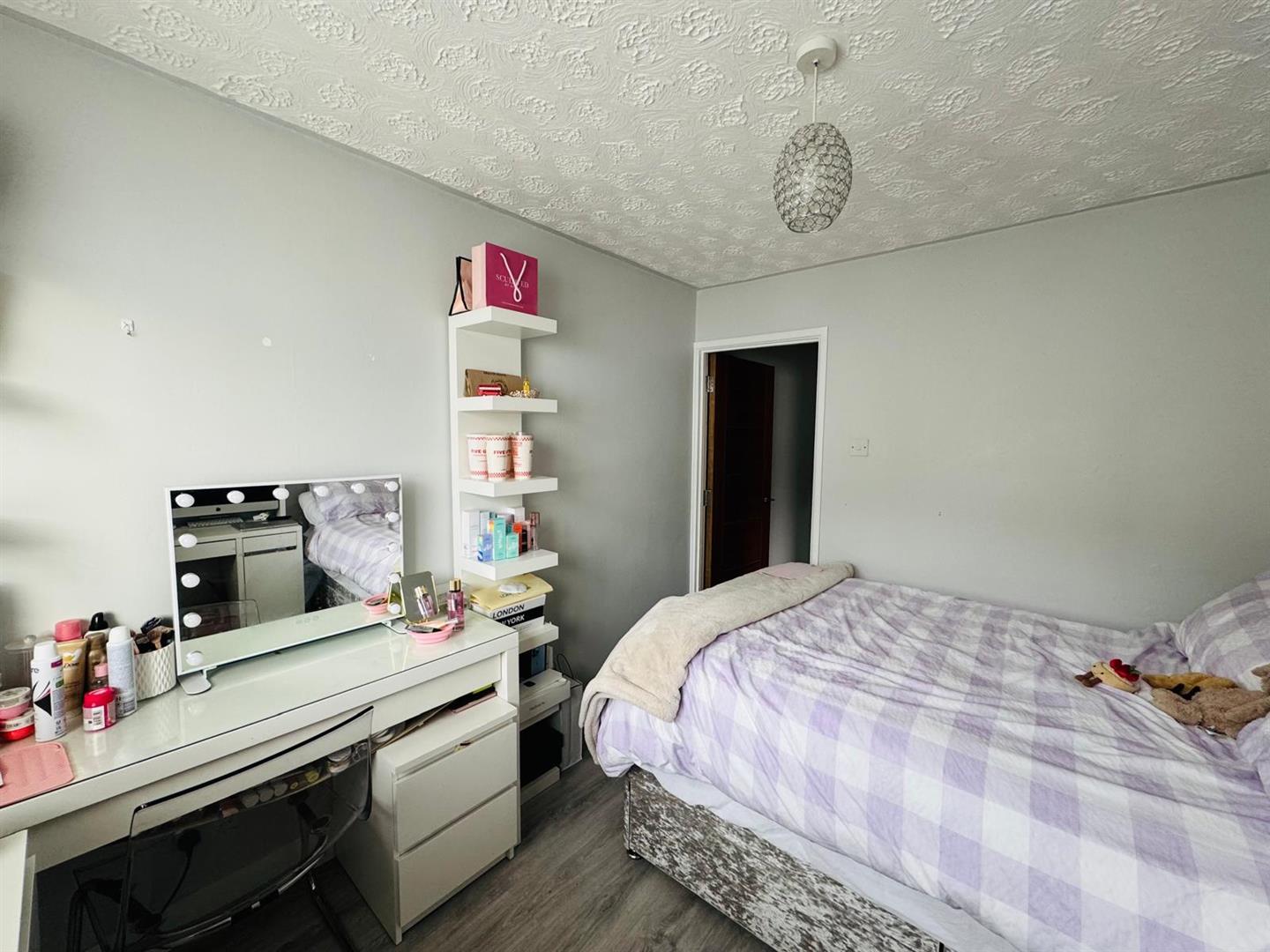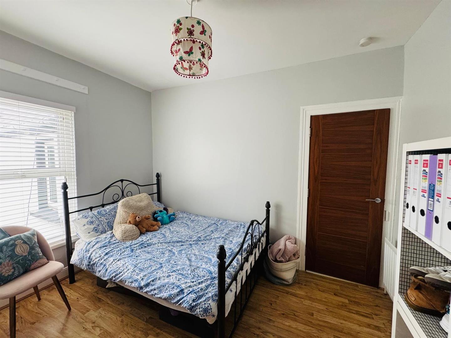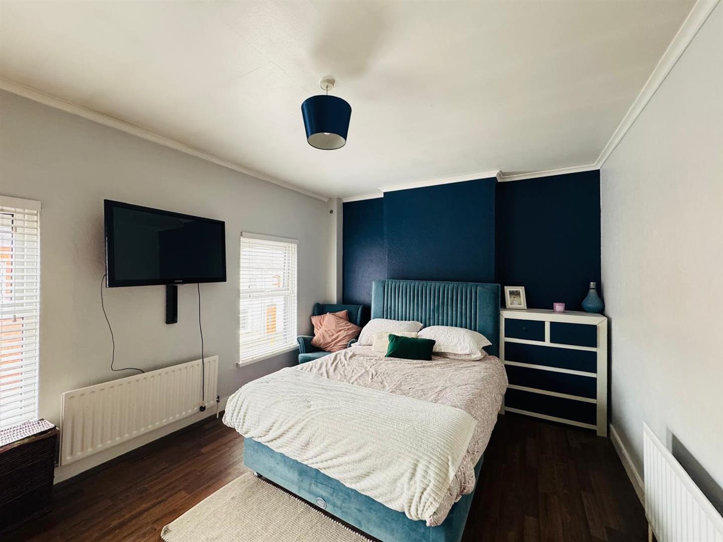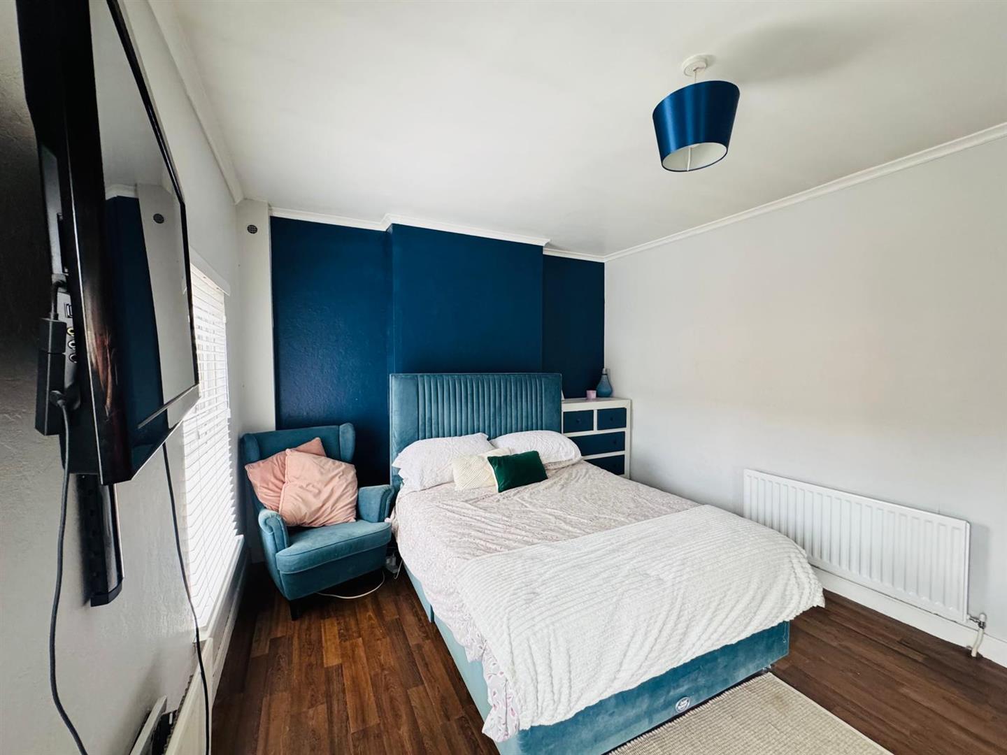 Having radiator cover and laminated wooden floor.