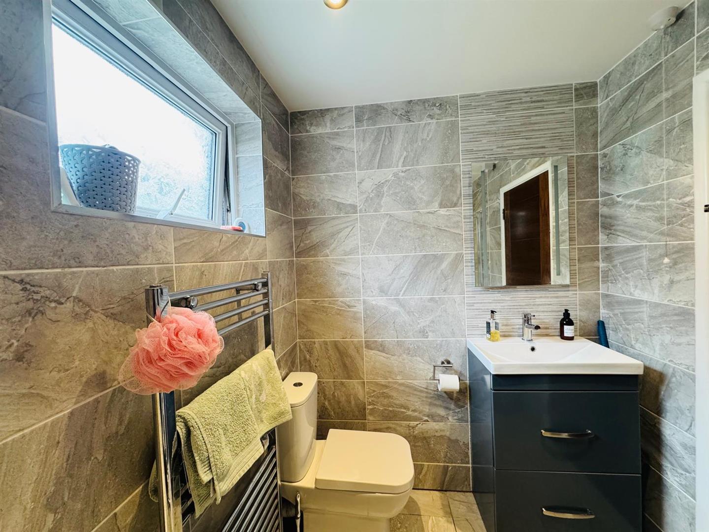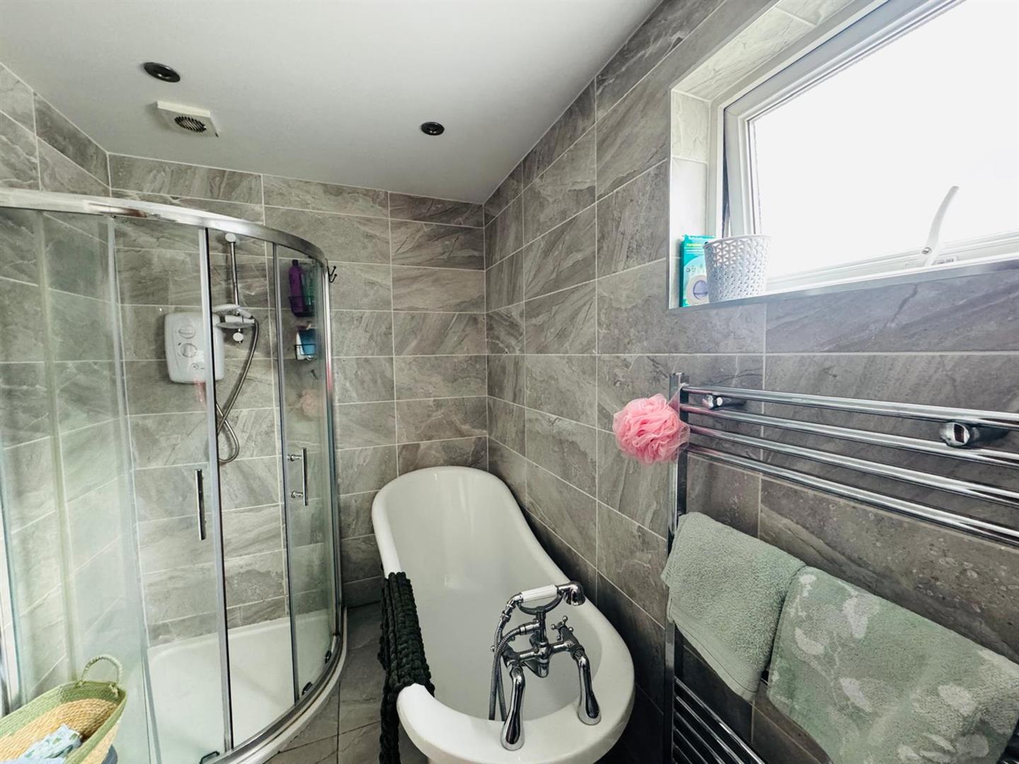Comprising claw foot bath with hand shower attachment to taps, walk in tiled shower, whb with storage under, wc, chrome radiator, fully tiled walls and floor.