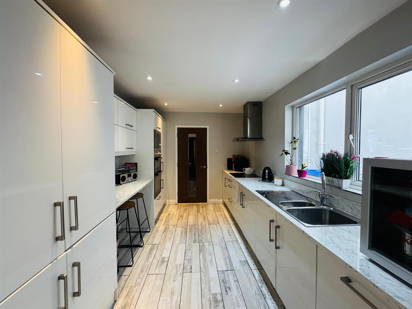 Having range of eye and low level units, 1 1/2 bowl stainless steel sink unit with mixer taps, hob, double oven, integrated microwave, integrated fridge/freezer and dishwasher, breakfast bar, recessed lighting, tiled floor.