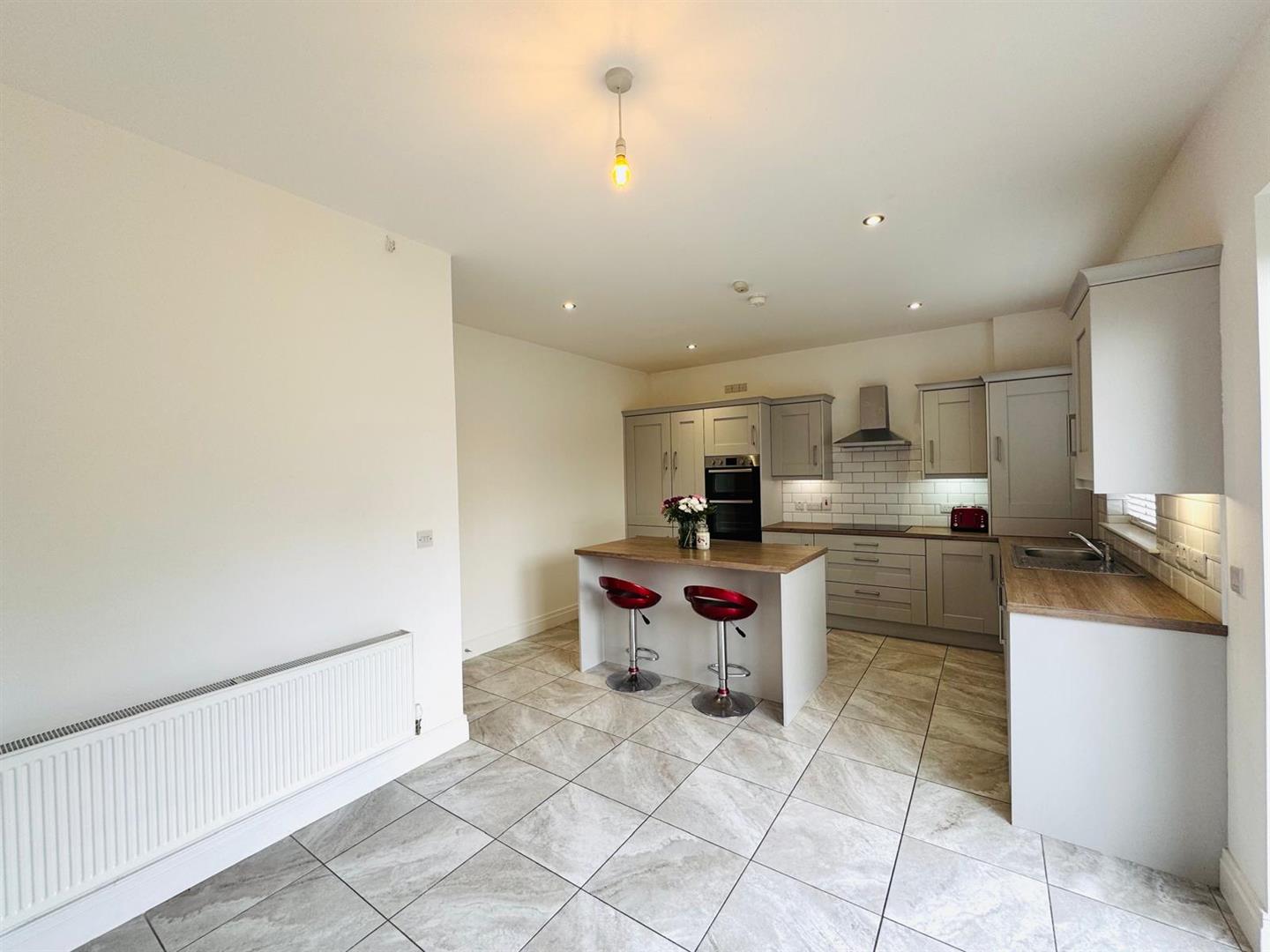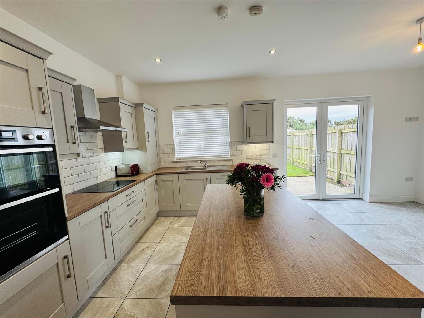 Having excellent range of eye and low level units, tiling between units, single drainer stainless steel sink unit with mixer taps, hob, double oven, extractor hood, integrated fridge/freezer and dishwasher, centre island with storage under, recessed lighting, tiled floor, ample dining space with French doors to rear.