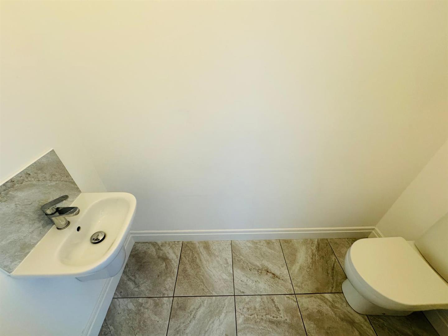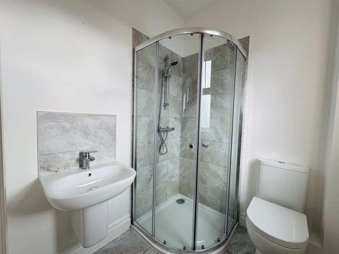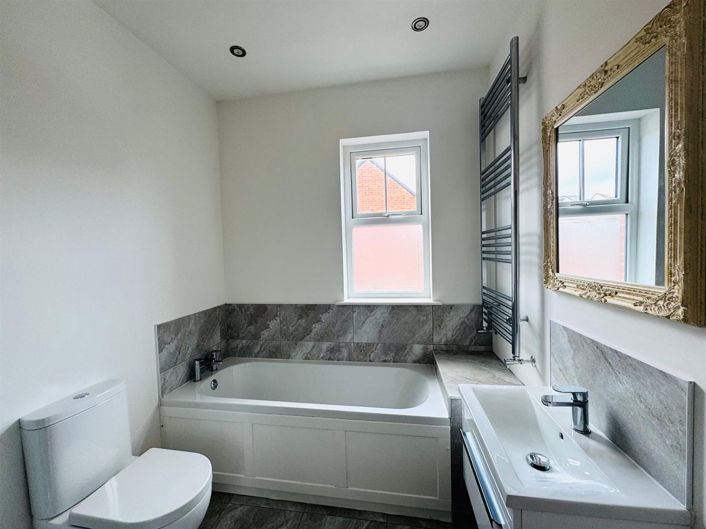 Comprising bath, tiled walk in electric shower, whb and wc, chrome radiator, recessed lighting, tiled floor.