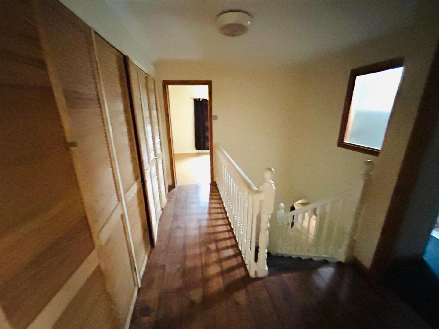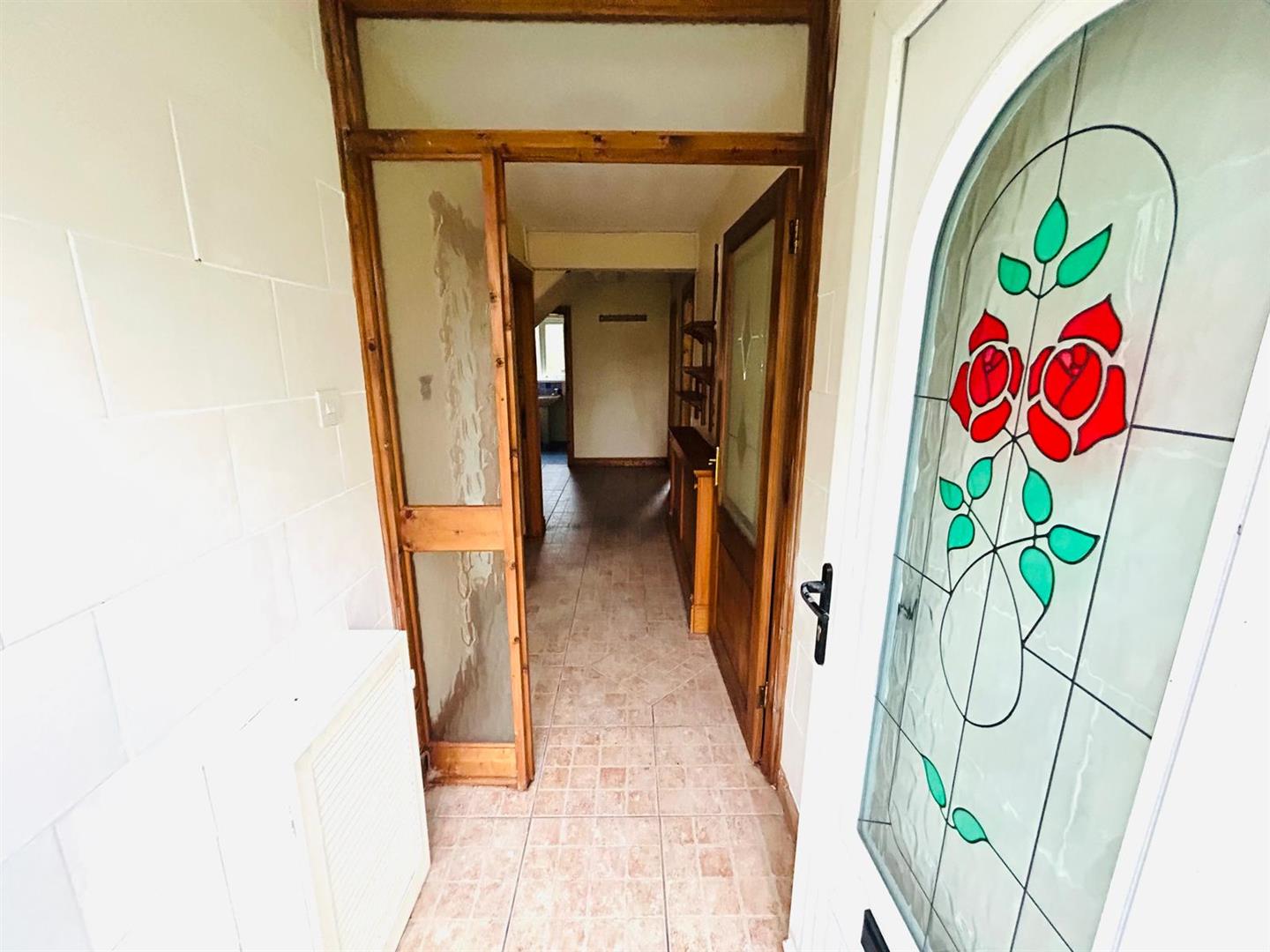 Comprising bath with tiling around, whb with tiling around, wc, fully tiled walk in electric shower, 1/2 height wooden panelled and 1/2 tiled walls, tiled floor, glazed door to hallway.