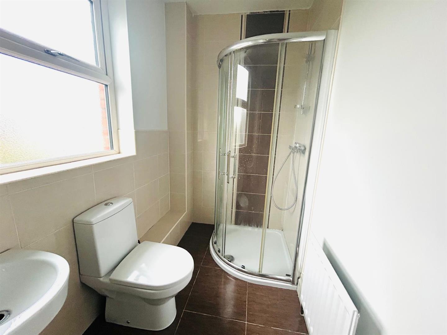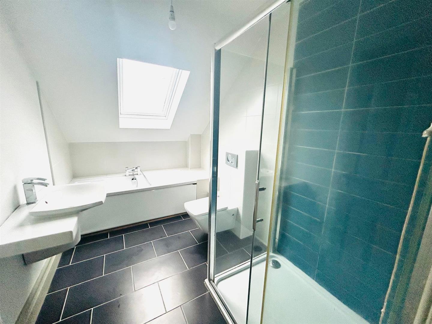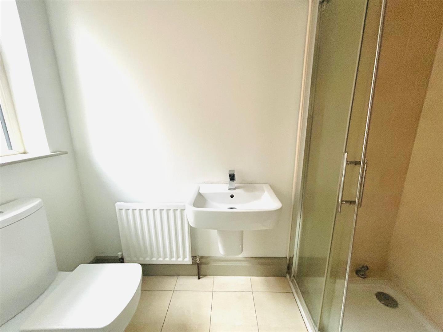 Comprising fully tiled walk in shower, whb with mixer taps, wc, partly tiled walls, tiled floor, extractor fan.