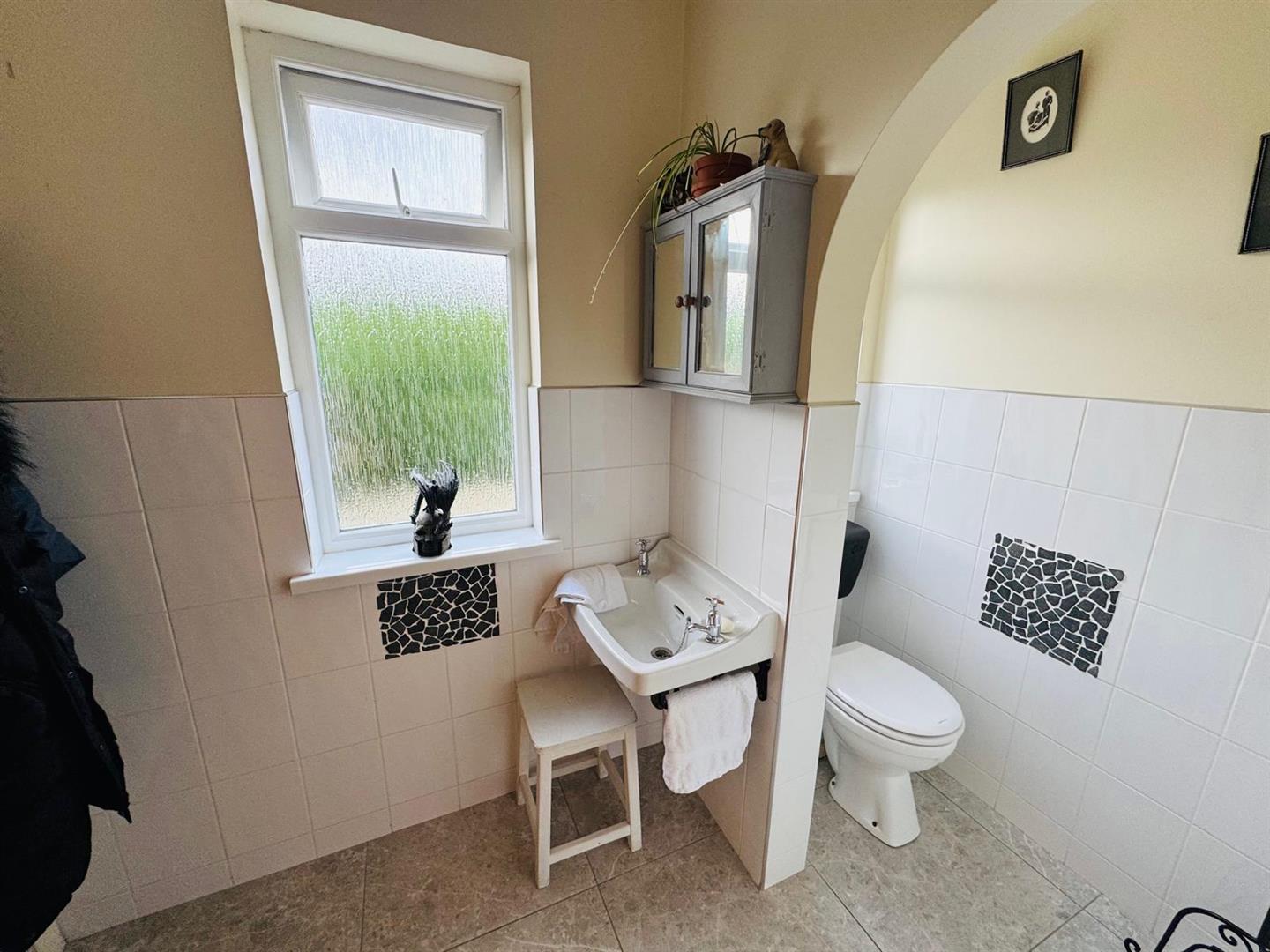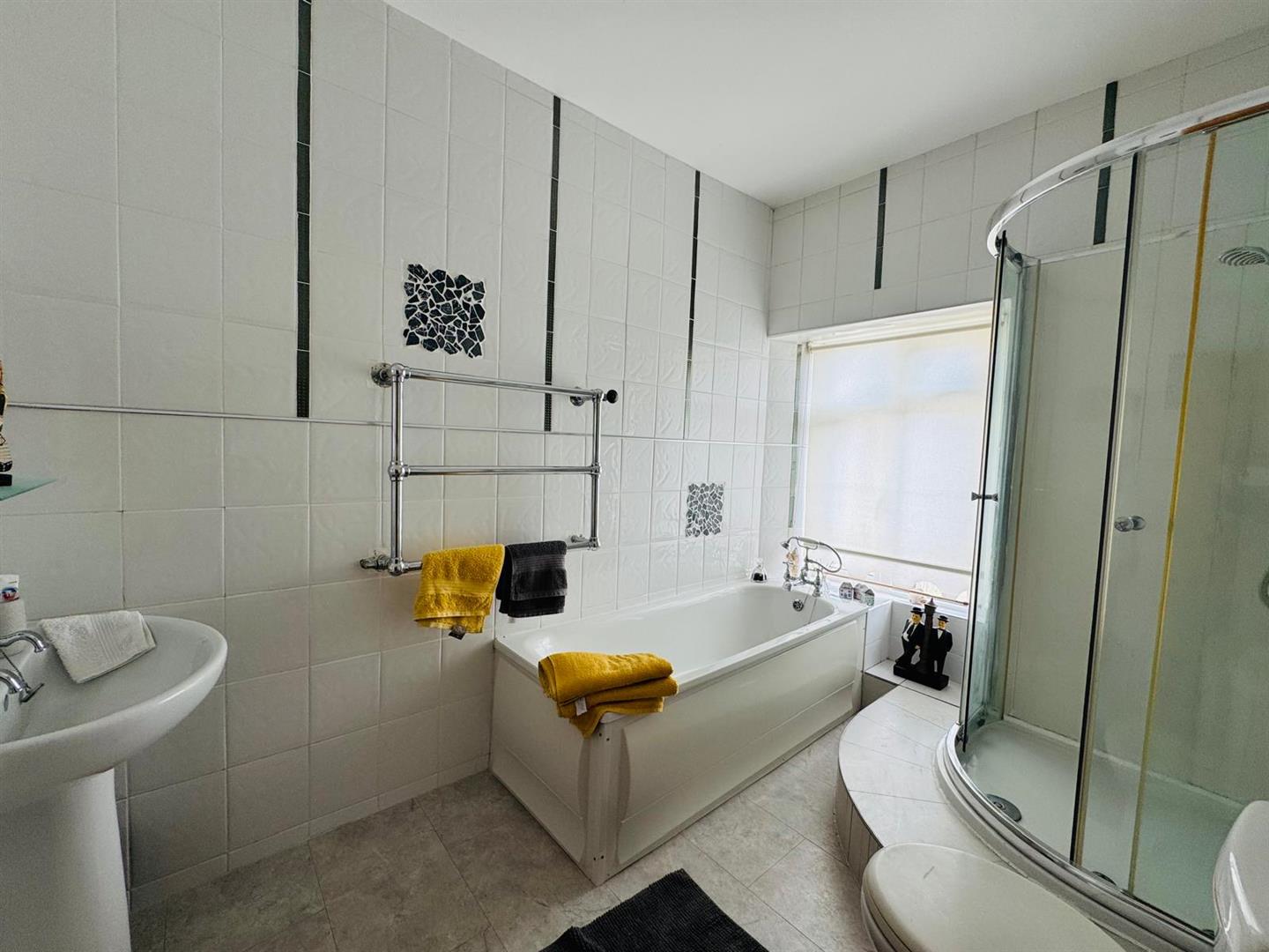 Comprising bath with shower fitting to taps, walk in shower, whb and wc, chrome radiator, fully tiled walls and floor.