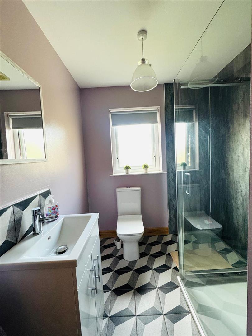 Comprising walk in electric shower with PVC cladding to walls, whb set in vanity unit, wc, tiled floor.
