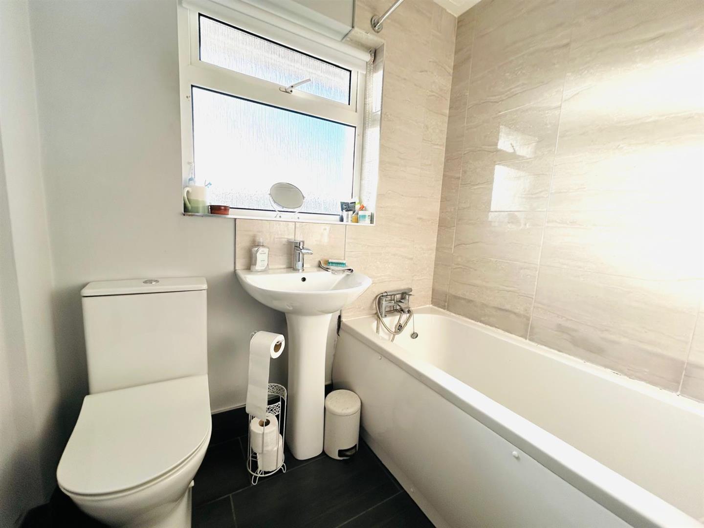 Comprising bath with electric shower over and tiling around, whb with mixer taps and tiling around, wc, tiled floor.