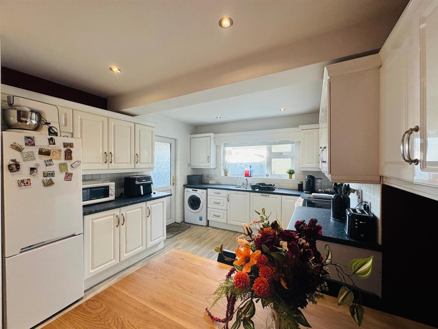 Having range of eye and low level units, single drainer stainless steel sink unit with mixer taps, wired for electric cooker, extractor hood, plumbed for washing machine, integrated dishwasher, space for fridge/freezer, hotpress, dining space, recessed lighting.