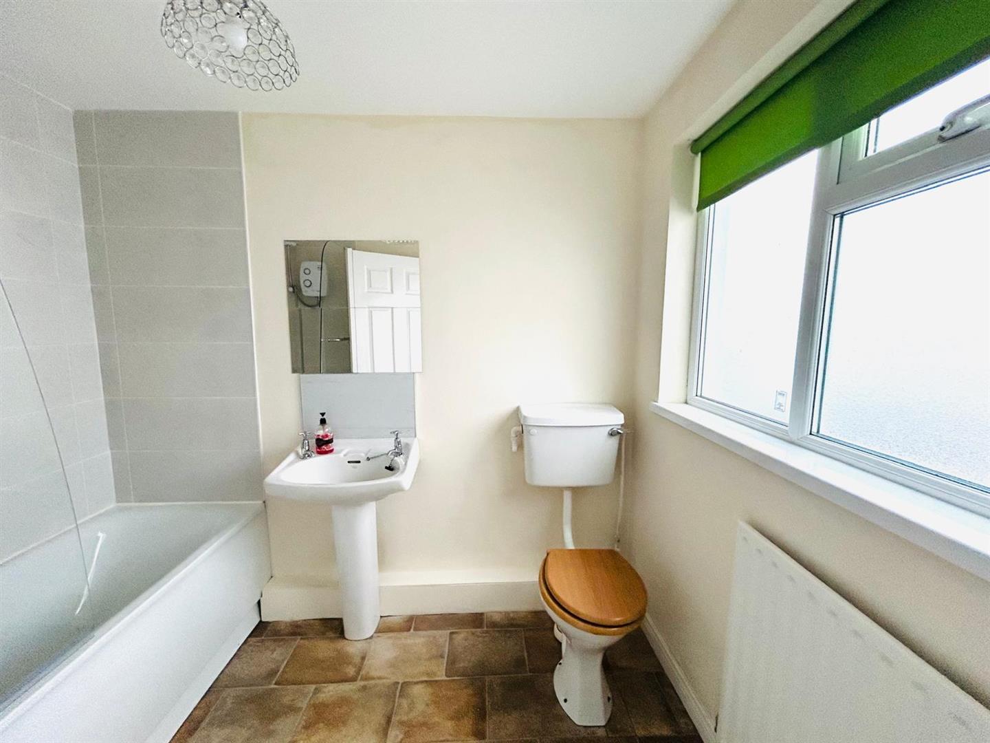 Comprising bath with electric shower over and tiling around, whb and wc.
