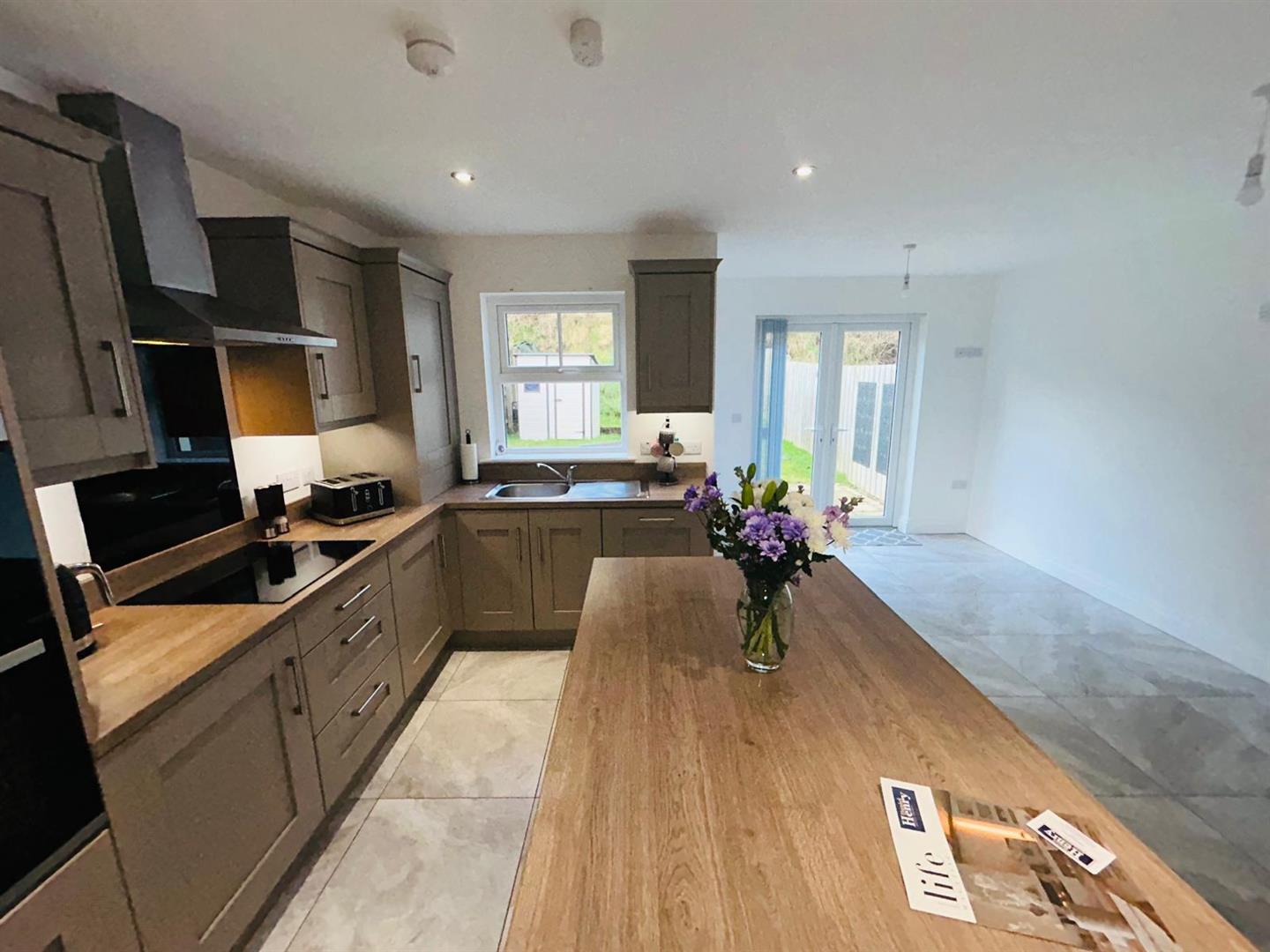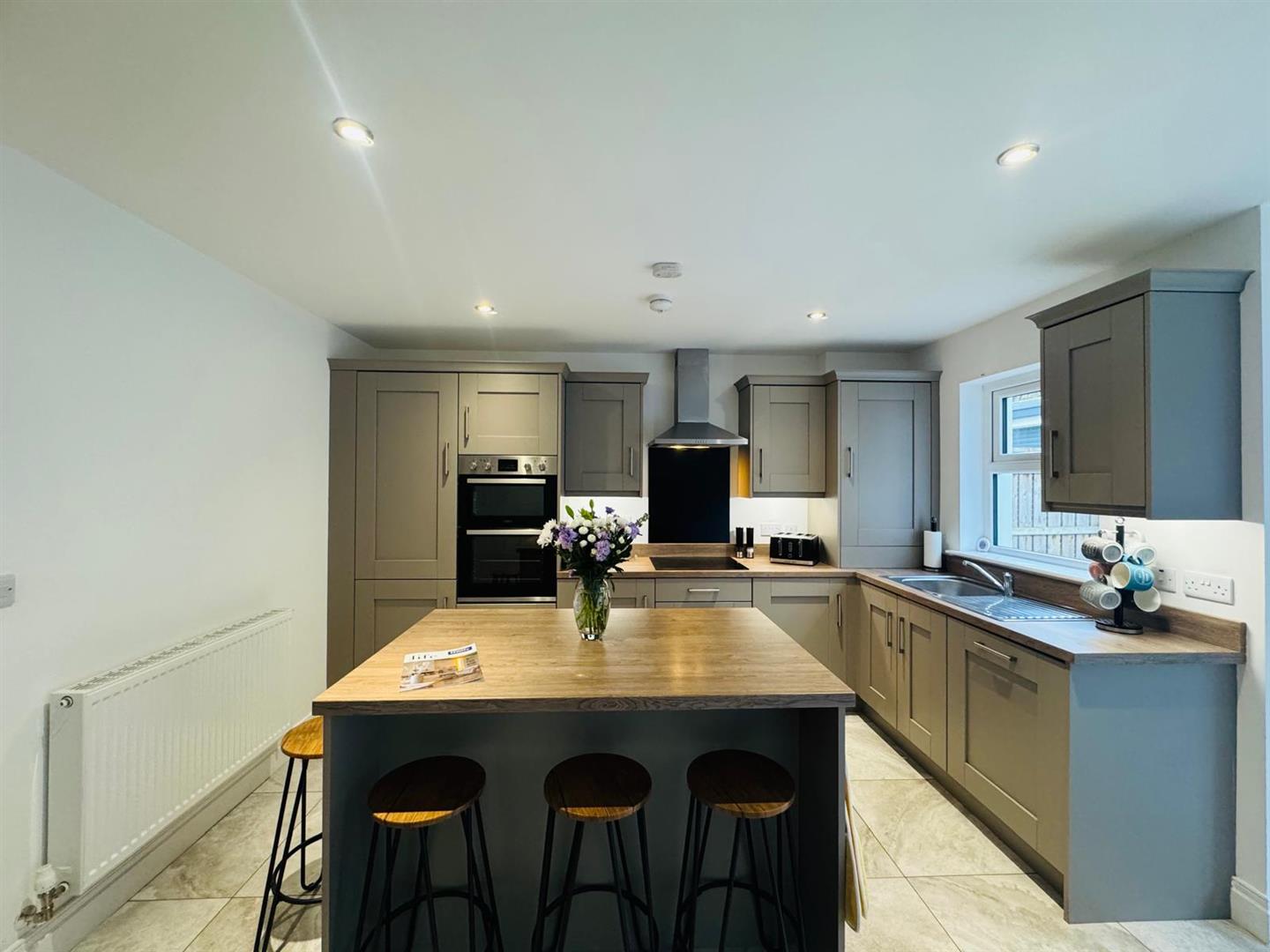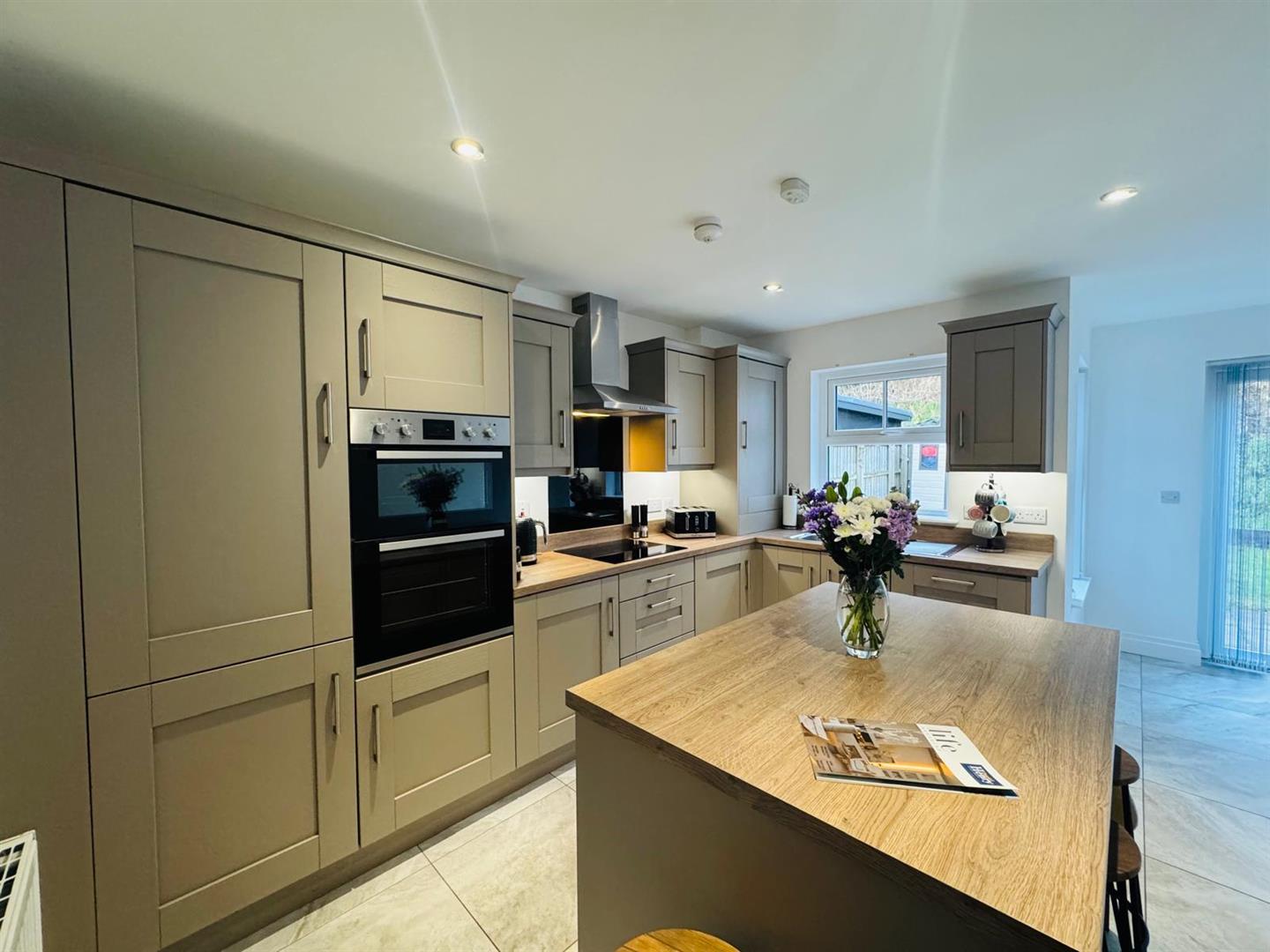 Having range of eye and low level modern units, single drainer stainless steel sink unit with mixer taps, hob, double oven, stainless steel extractor hood, centre island with breakfast bar and storage, integrated fridge/freezer and dishwasher, integrated washer/dryer, recessed lighting, French doors to rear, ample dining space, tiled floor.