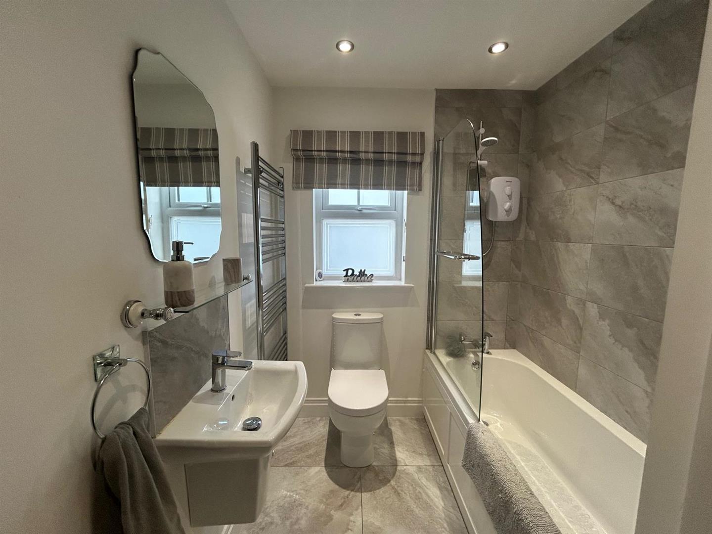 Comprising bath with mixer taps with electric shower over, shower screen, whb and wc, chrome radiator, airing cupboard, recessed lighting, tiled floor.