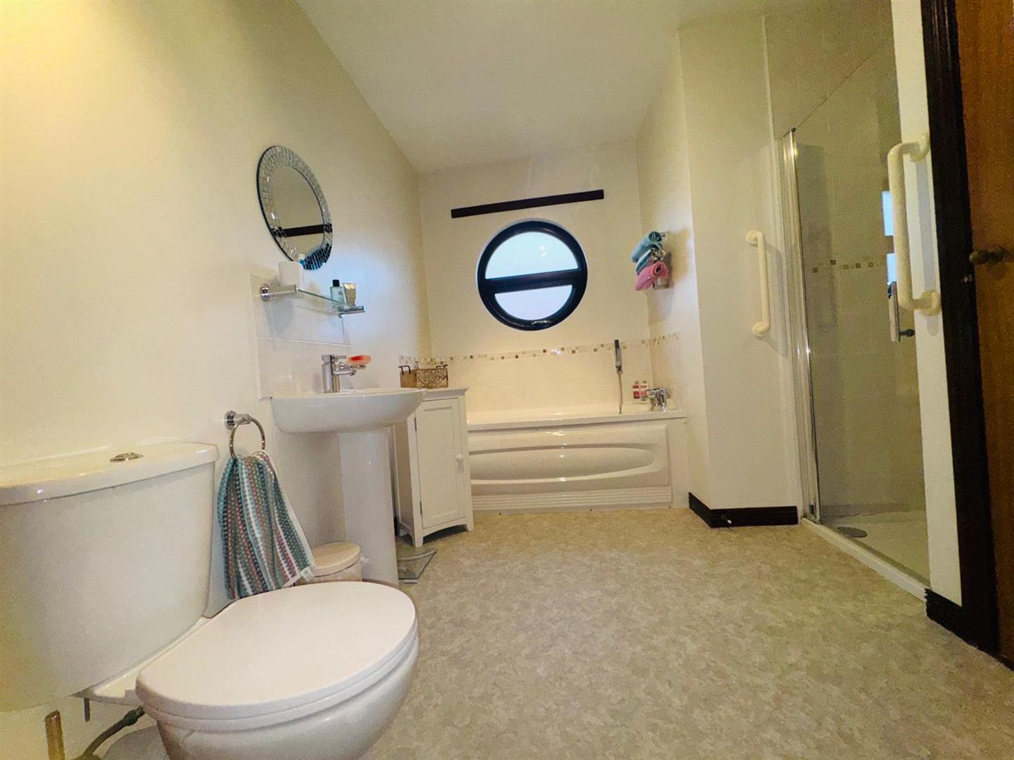 Comprising bath with shower fitting to taps, whb and wc, fully tiled walk in electric shower, porthole window.