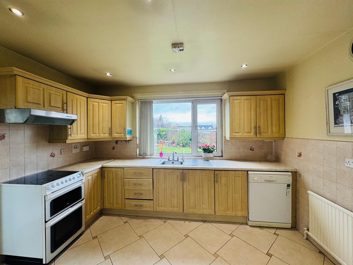 Having eye and low level units, tiling between units, single drainer stainless steel sink unit with mixer taps, wired for cooker, extractor hood, plumbed for dishwasher, space for fridge/freezer, hotpress, recessed lighting, tiled floor.