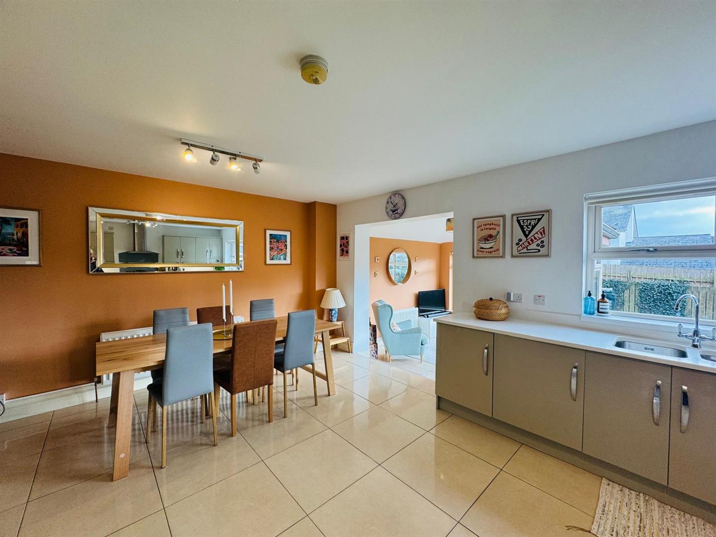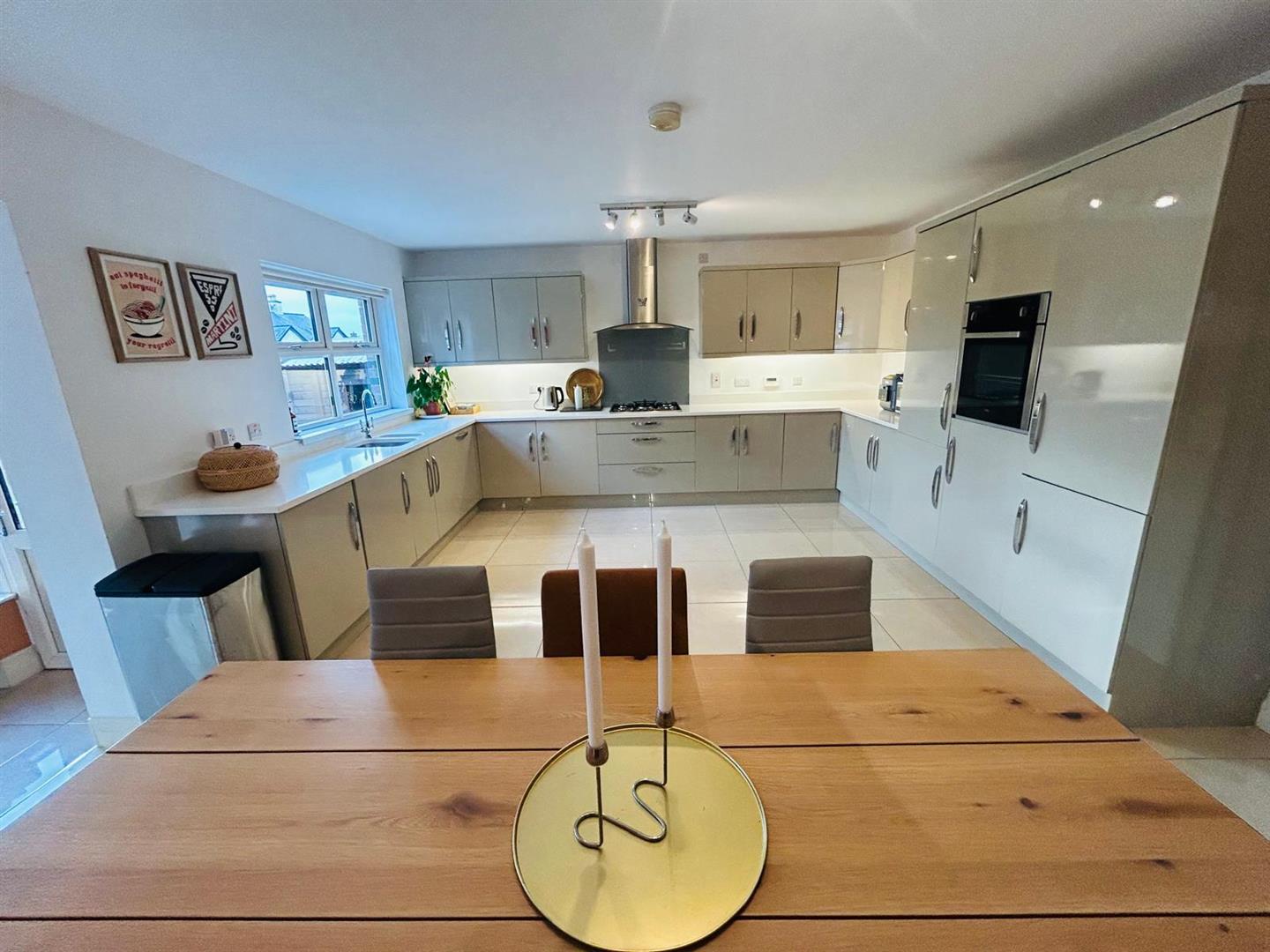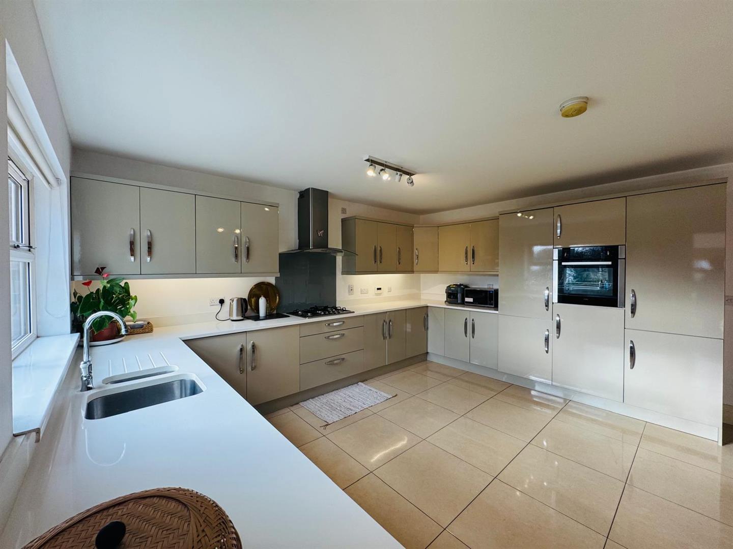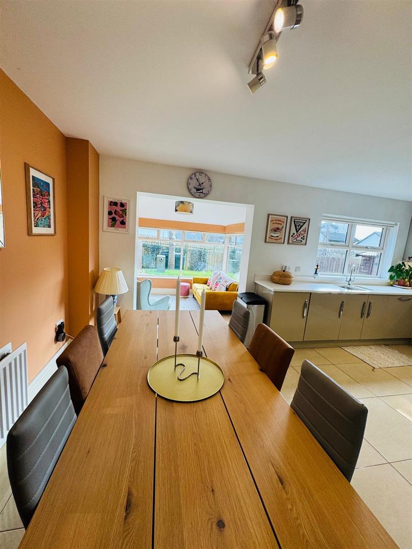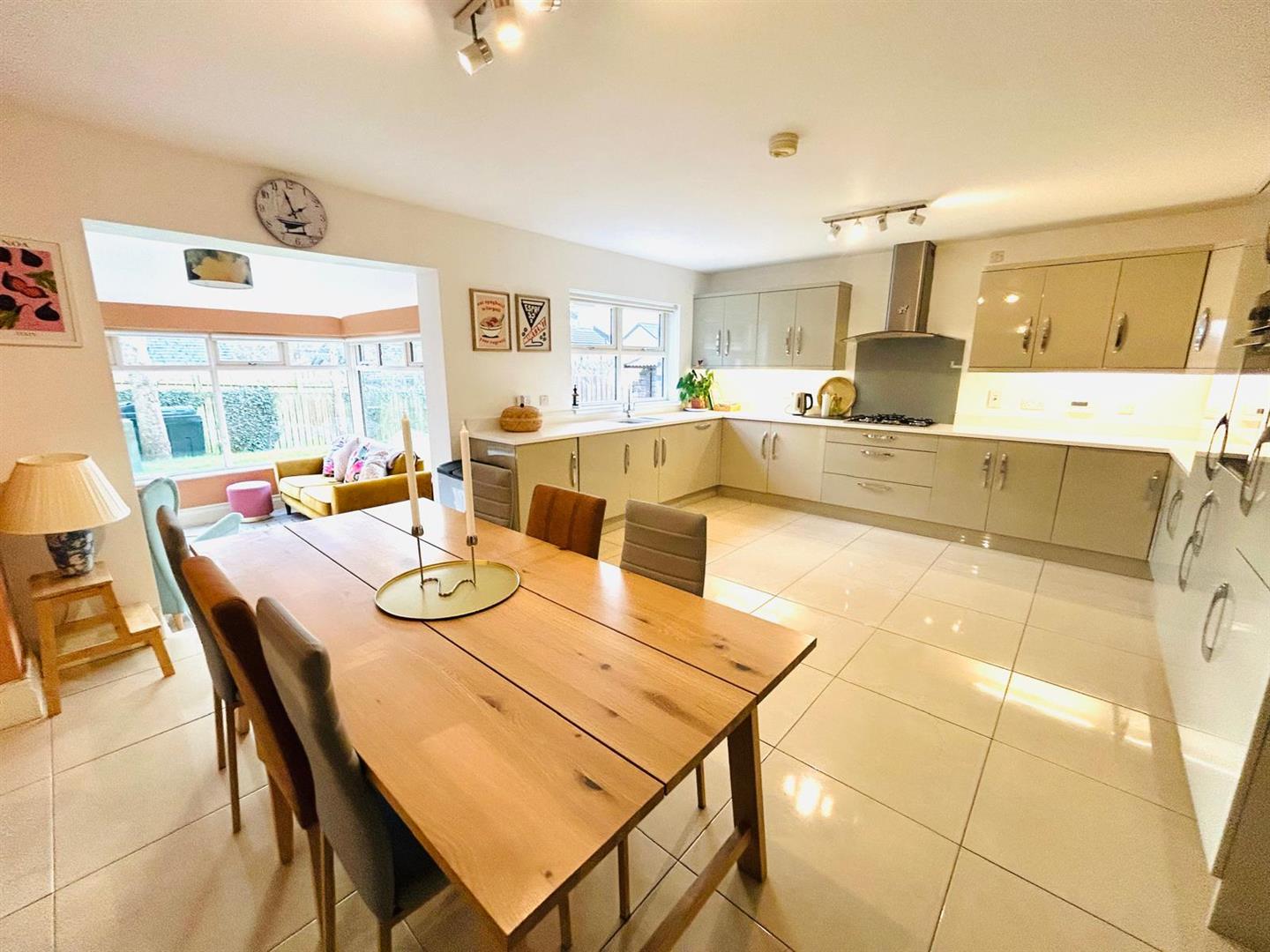 Having excellent range of eye and low level units, 1 1/2 bowl stainless steel sink unit with mixer taps set in 'Quartz' worktop with matching splashback, gas hob, oven, stainless steel extractor hood, integrated fridge/freezer, dishwasher and washing machine, tiled floor, spacious dining area open plan to Sunroom.