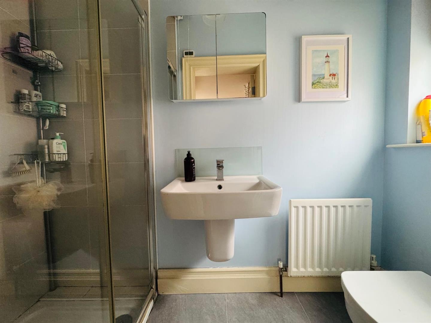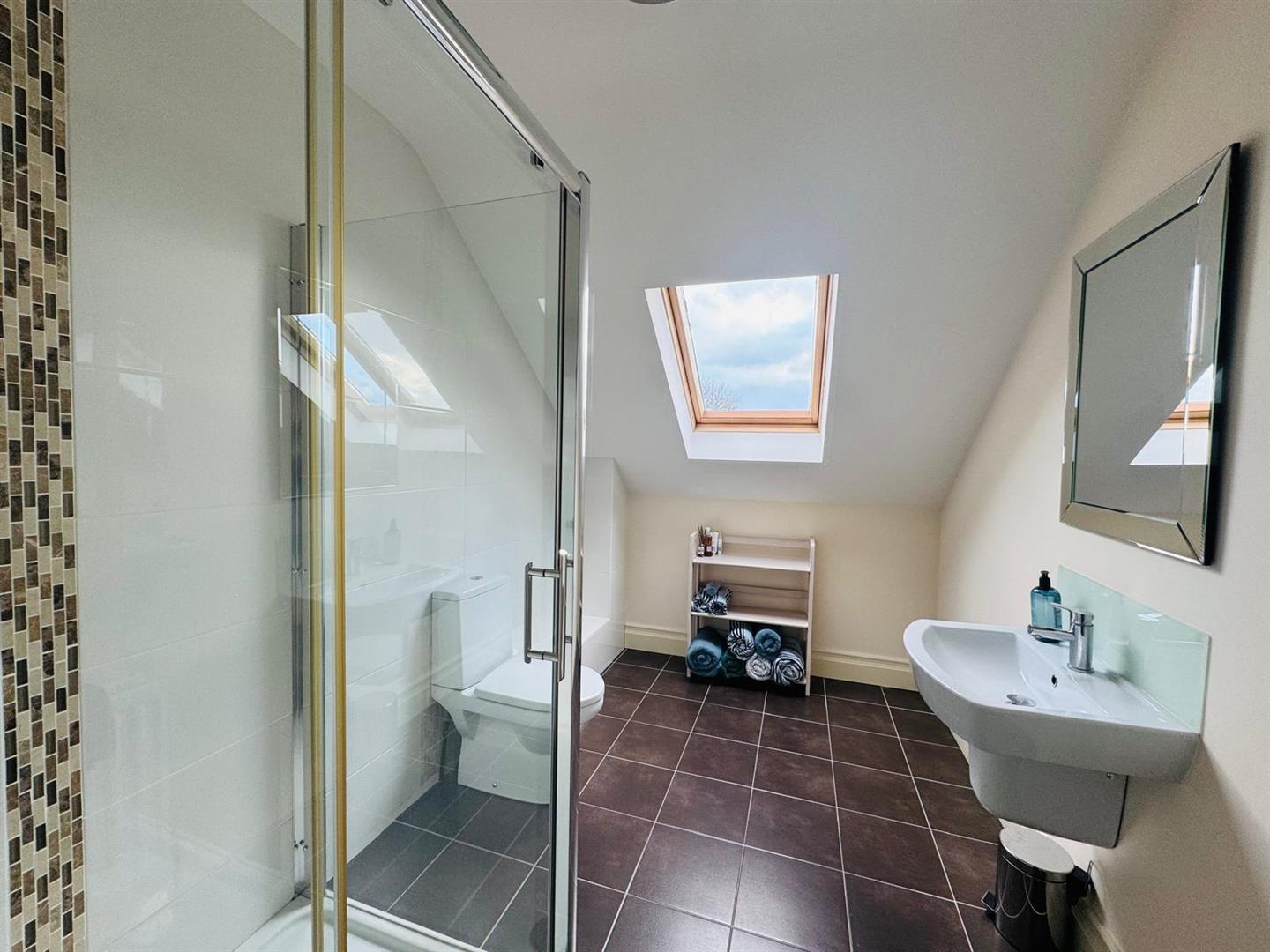 Comprising fully tiled walk in shower, whb and wc, partly tiled walls, tiled floor.