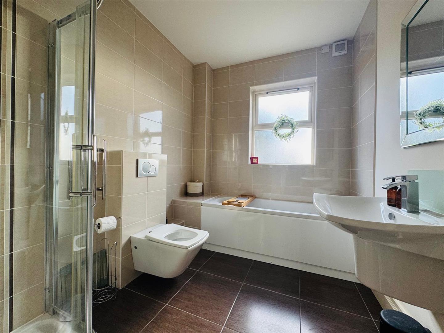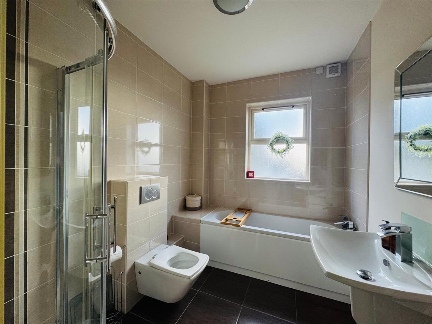Comprising bath with shower fitting to taps, whb and wc, fully tiled walk in shower, partly tiled walls, tiled floor.