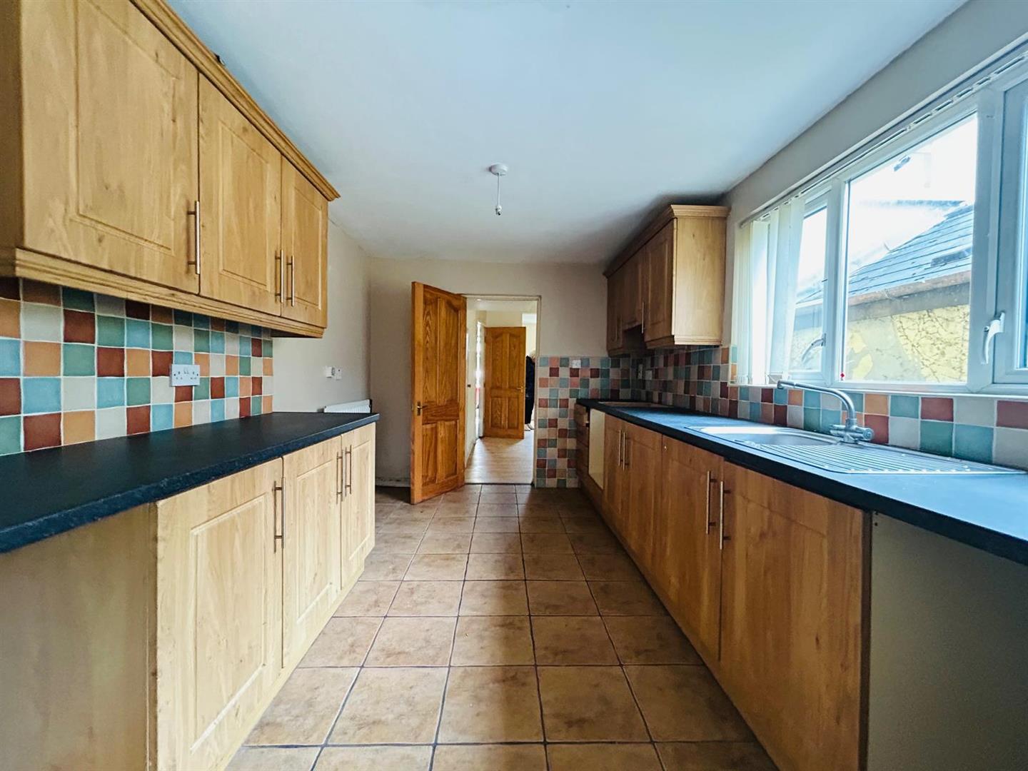 Having eye and low level units, tiling between units, single drainer stainless steel sink unit with mixer taps, space for hob and underoven, plumbed for washing machine, tiled floor.