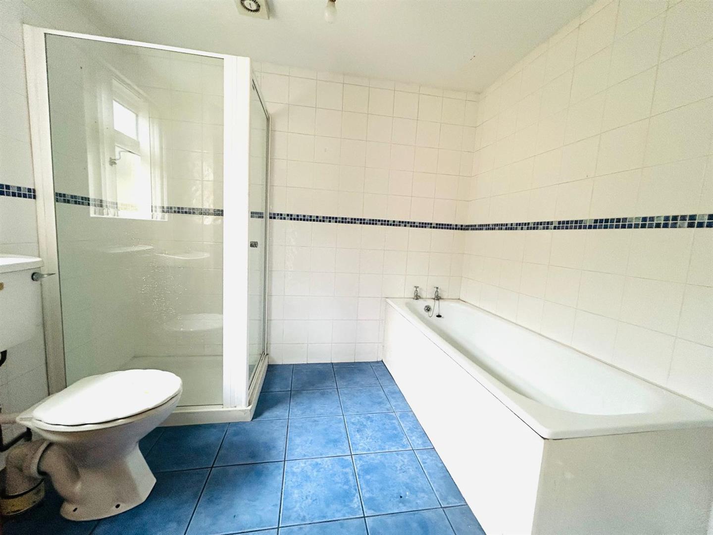 Comprising bath, walk in shower, whb, wc, fully tiled walls and floor.