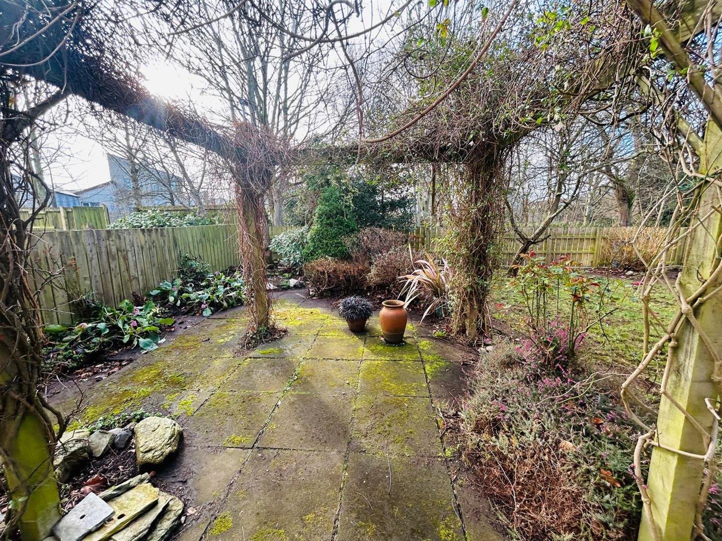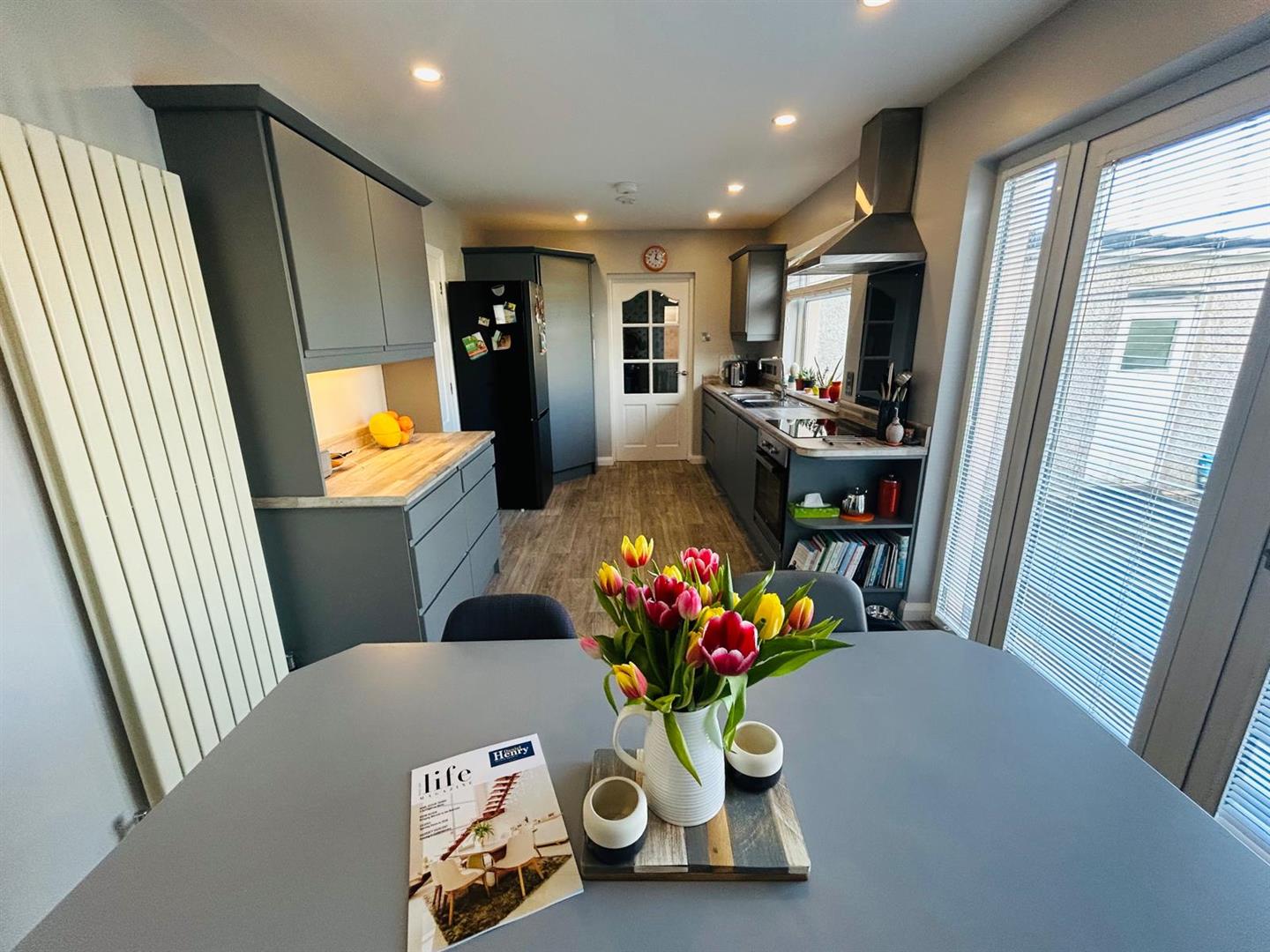 Having eye and low level units, 1 1/2 bowl single drainer stainless steel sink unit with mixer taps, integrated hob and underoven, stainless steel extractor hood, integrated dishwasher, larder, French doors, recessed lighting.