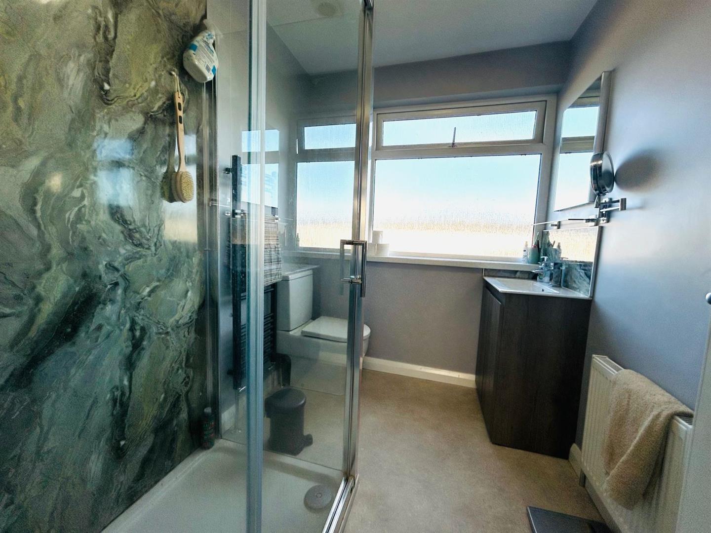 Comprising walk in electric shower with PVC cladding to walls, whb set in vanity unit with mixer taps and PVC cladding around, extractor fan, black towel radiator.