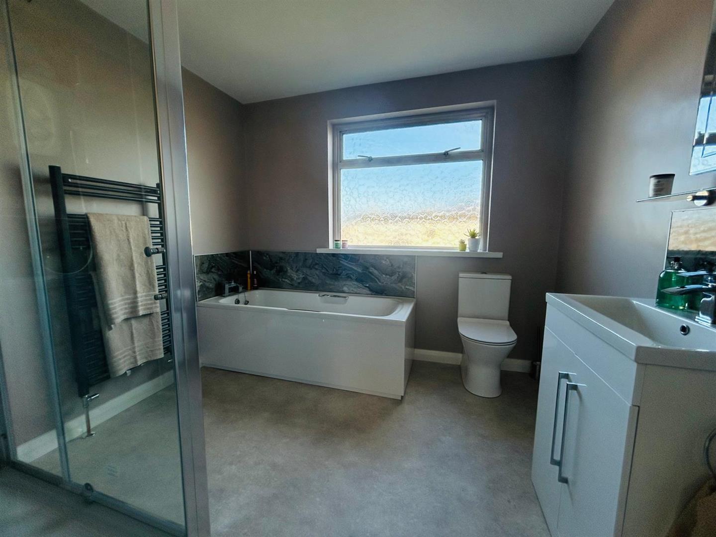 Comprising bath with mixer taps and PVC cladding around, walk in electric shower with PVC cladding, whb set in vanity unit with mixer taps and PVC cladding around, black towel rail.