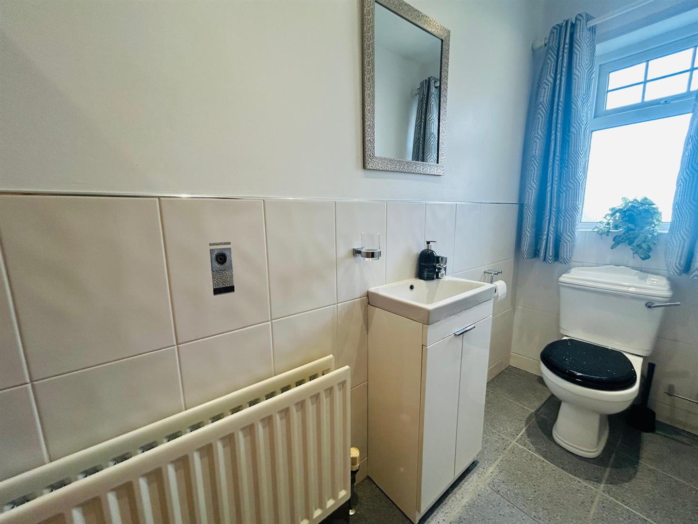 Comprising fully tiled walk in electric shower, whb set in vanity unit with mixer tap, wc, recessed lighting, 1/2 tiled walls, tiled floor.