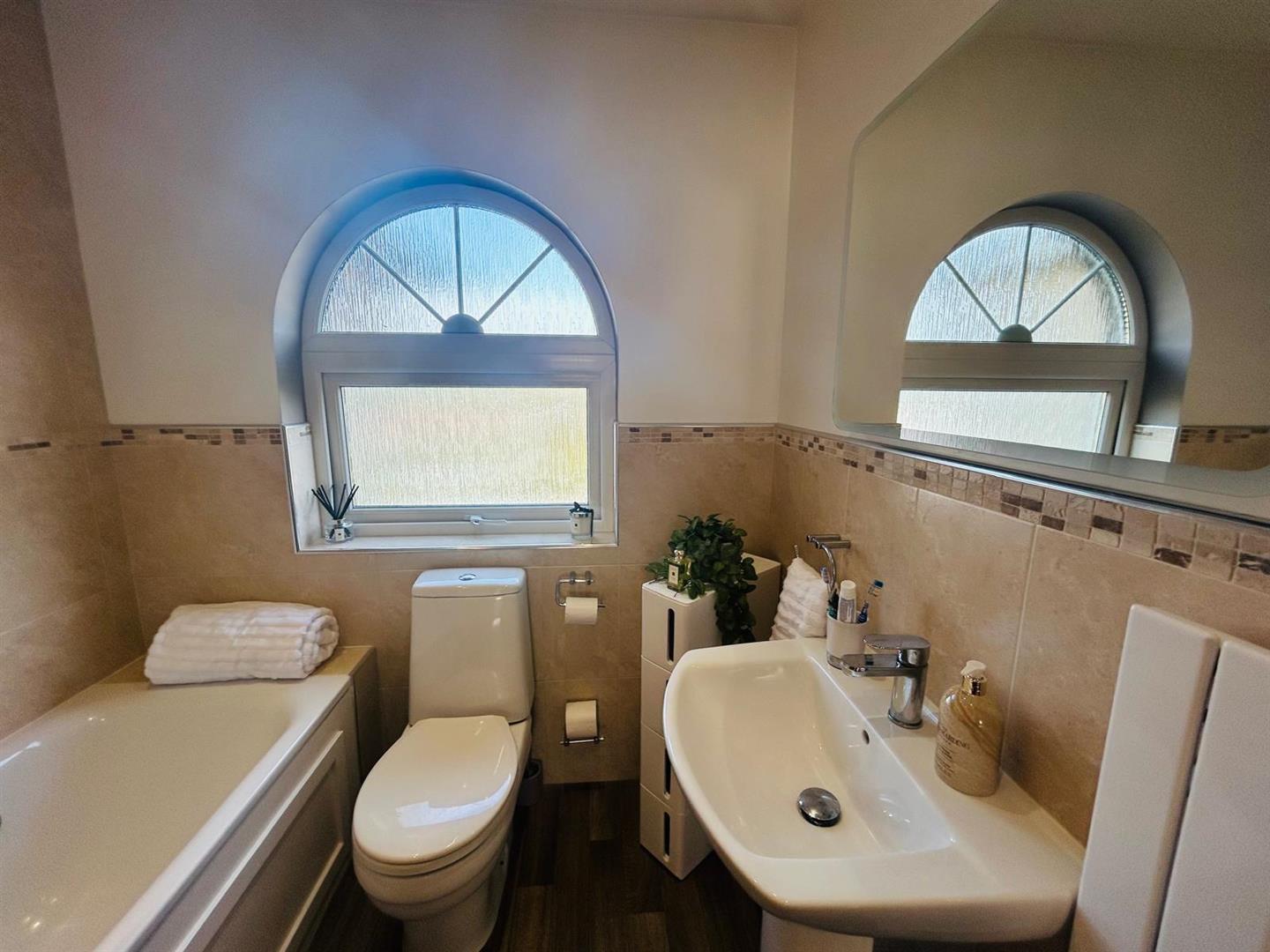 Comprising bath with mixer tap, electric shower over with tiling around and shower screen, whb with mixer tap, wc, recessed lighting, 1/2 tiled walls.