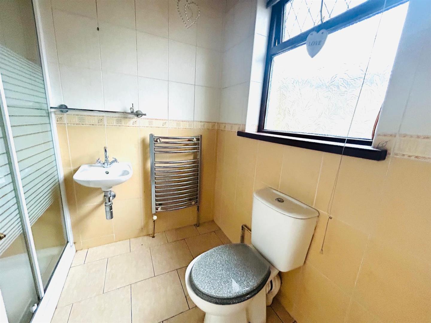 Comprising fully tiled walk in electric shower, whb with mixer taps, wc, chrome towel rail, fully tiled walls, tiled floor.
