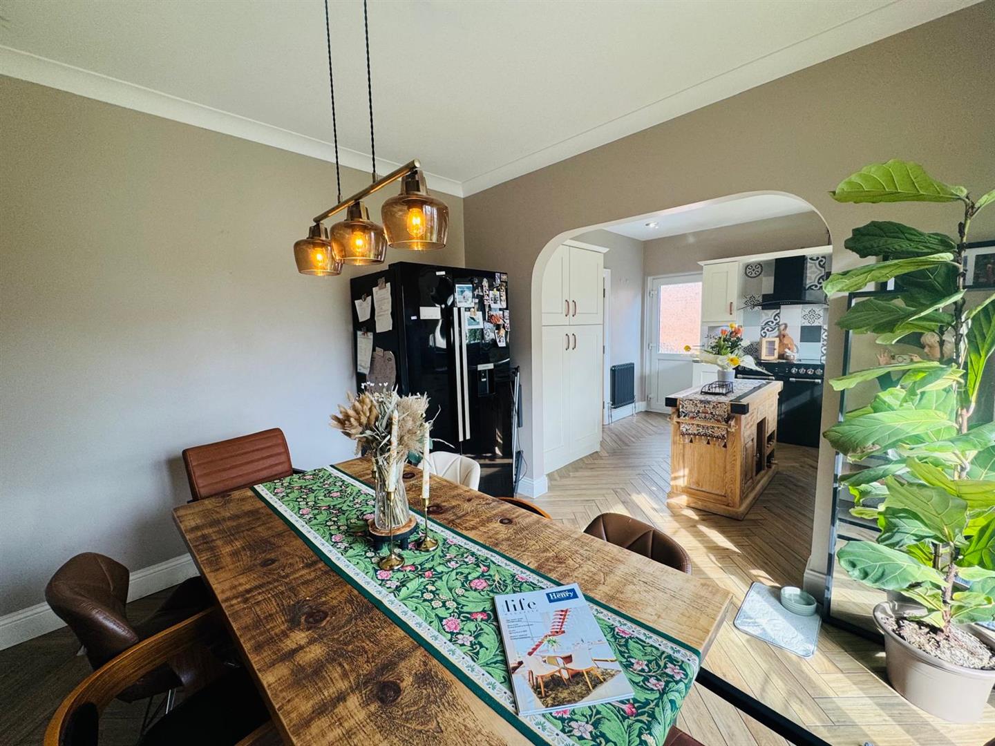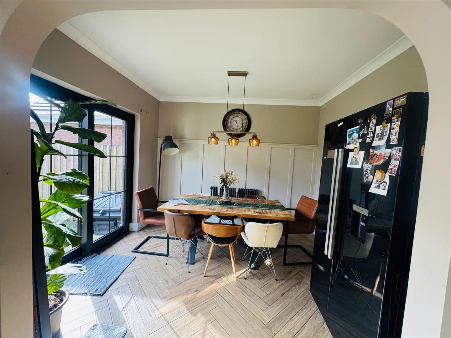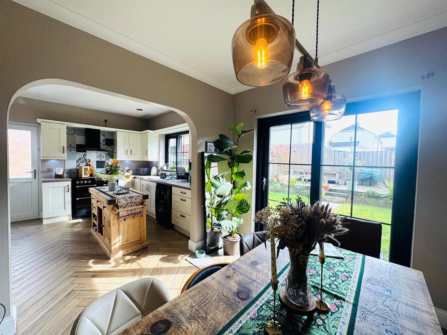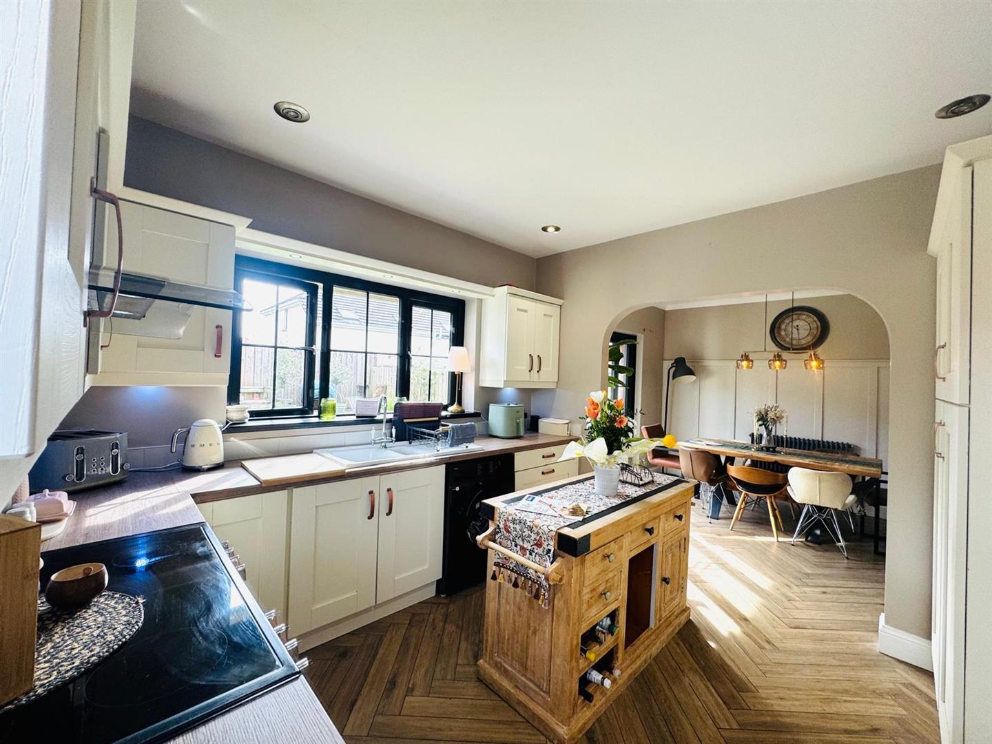 Having range of eye and low level units, window pelmet with lighting, 1 1/2 bowl sink unit with mixer taps, 'Leisure' cooking centre, extractor hood, plumbed for washing machine, recessed lighting, ample dining space with feature panelled wall, tiled floor, patio doors to rear.
