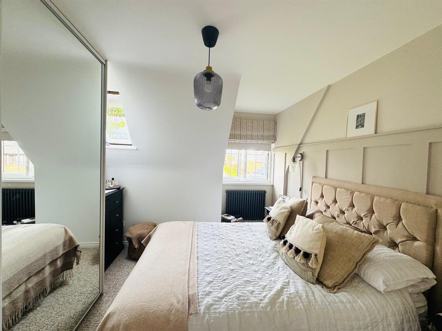 Having wall to wall built in wardrobes with sliding mirrored doors, feature panelled wall, feature radiator.