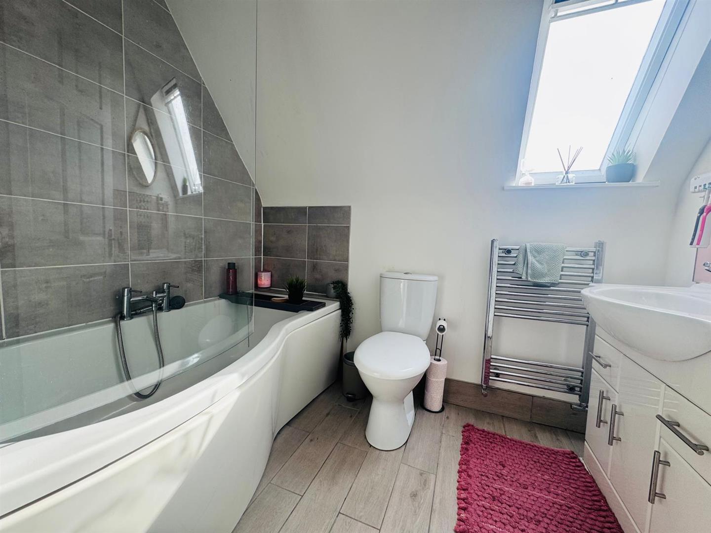 Comprising bath with electric shower over and tiling around, shower screen, whb set in vanity unit, wc, chrome radiator, tiled floor.