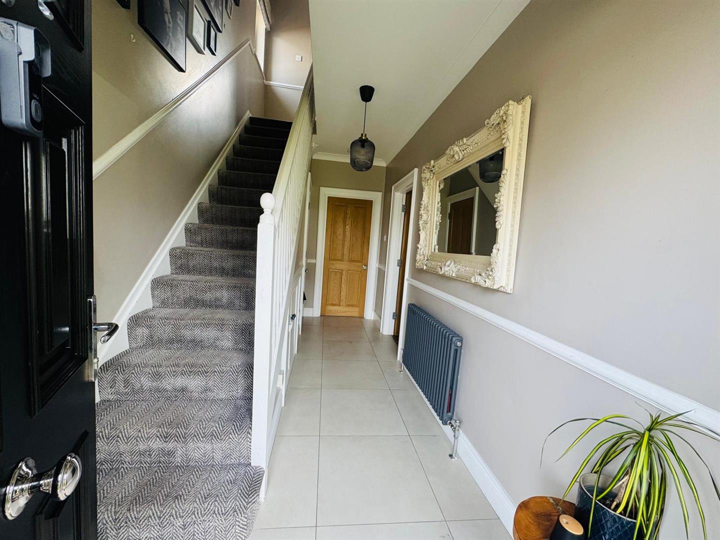 Having understairs storage, cloaks cupboard, ceiling cornicing, feature wall radiator.