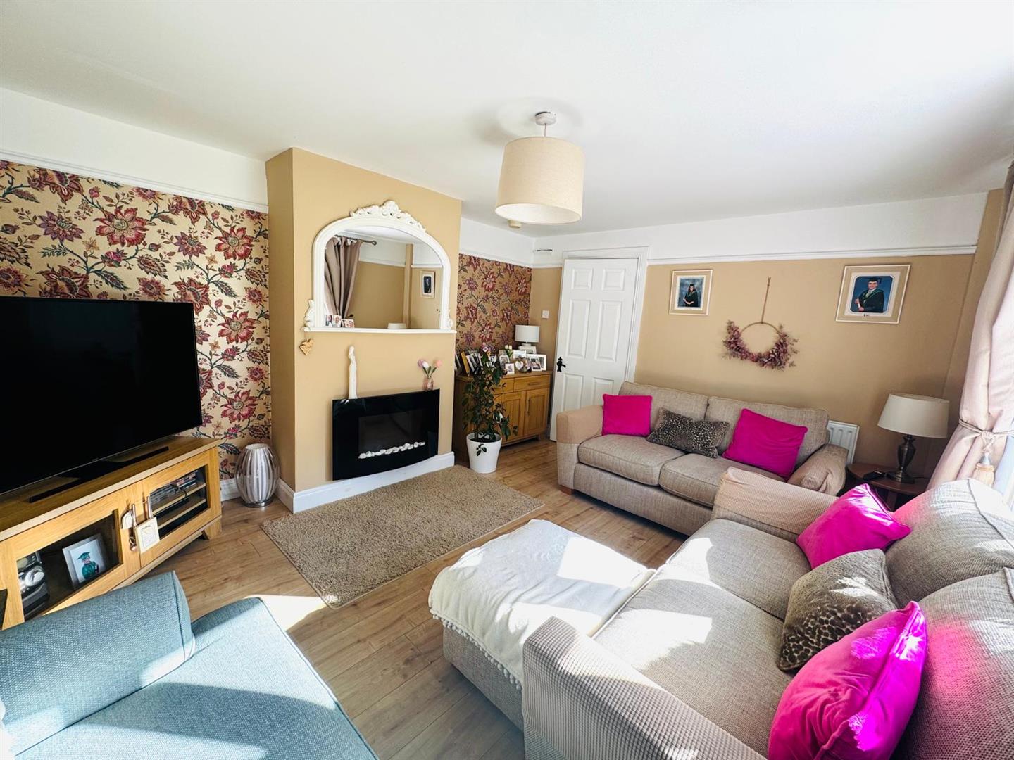 Having ornamental electric fire, picture rail, laminated wooden floor.