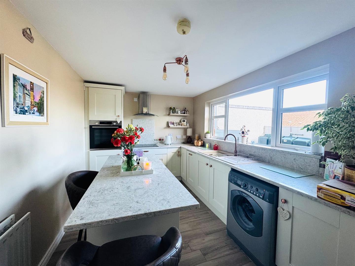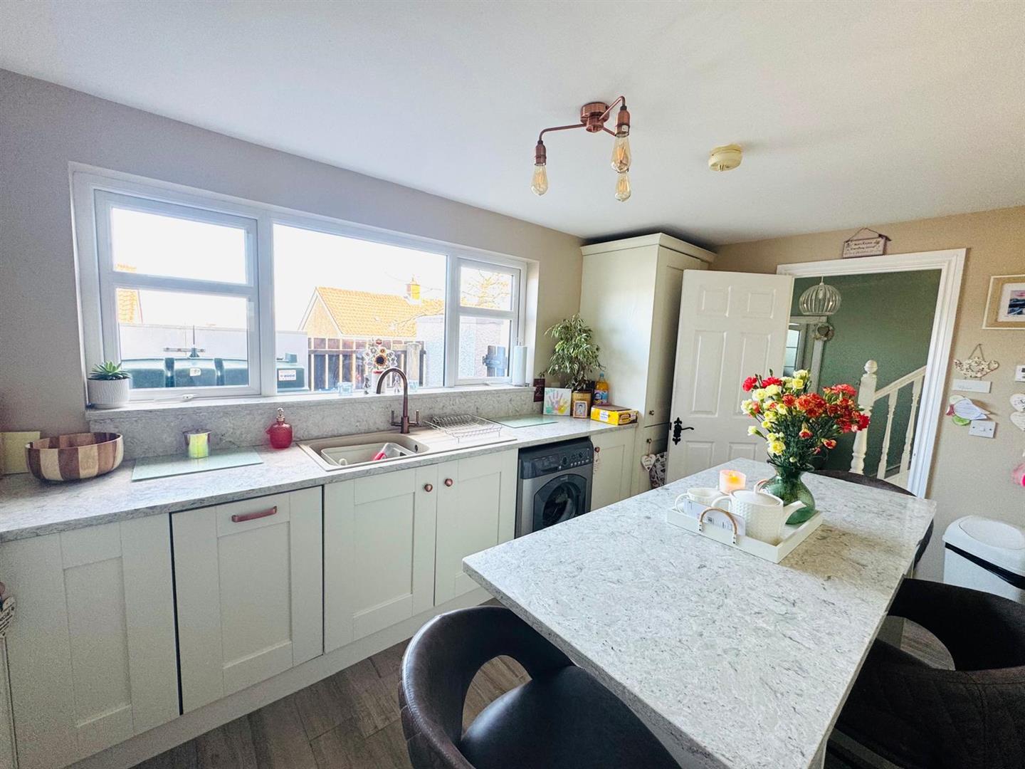 Having excellent range of eye and low level units, single drainer stainless steel sink unit with mixer taps set in granite worktop, hob, oven, stainless steel extractor hood, integrated fridge/freezer and dishwasher, plumbed for washing machine, centre island with matching granite worktop, storage under and breakfast bar, tiled floor.