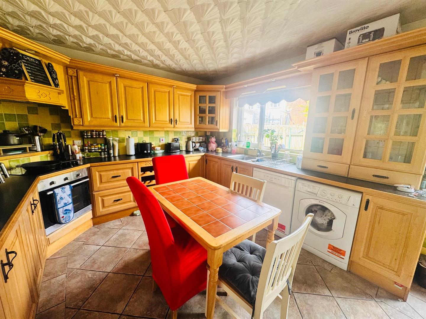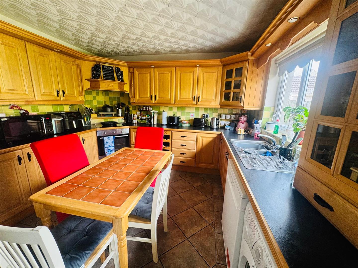 Having eye and low level units, matching window pelmet, tiling between units, 1 1/2 bowl single drainer stainless steel sink unit with mixer taps, hob and underoven set in corner with extractor hood, space for fridge/freezer, plumbed for washing machine and dishwasher, space for tumble dryer, tiled floor.