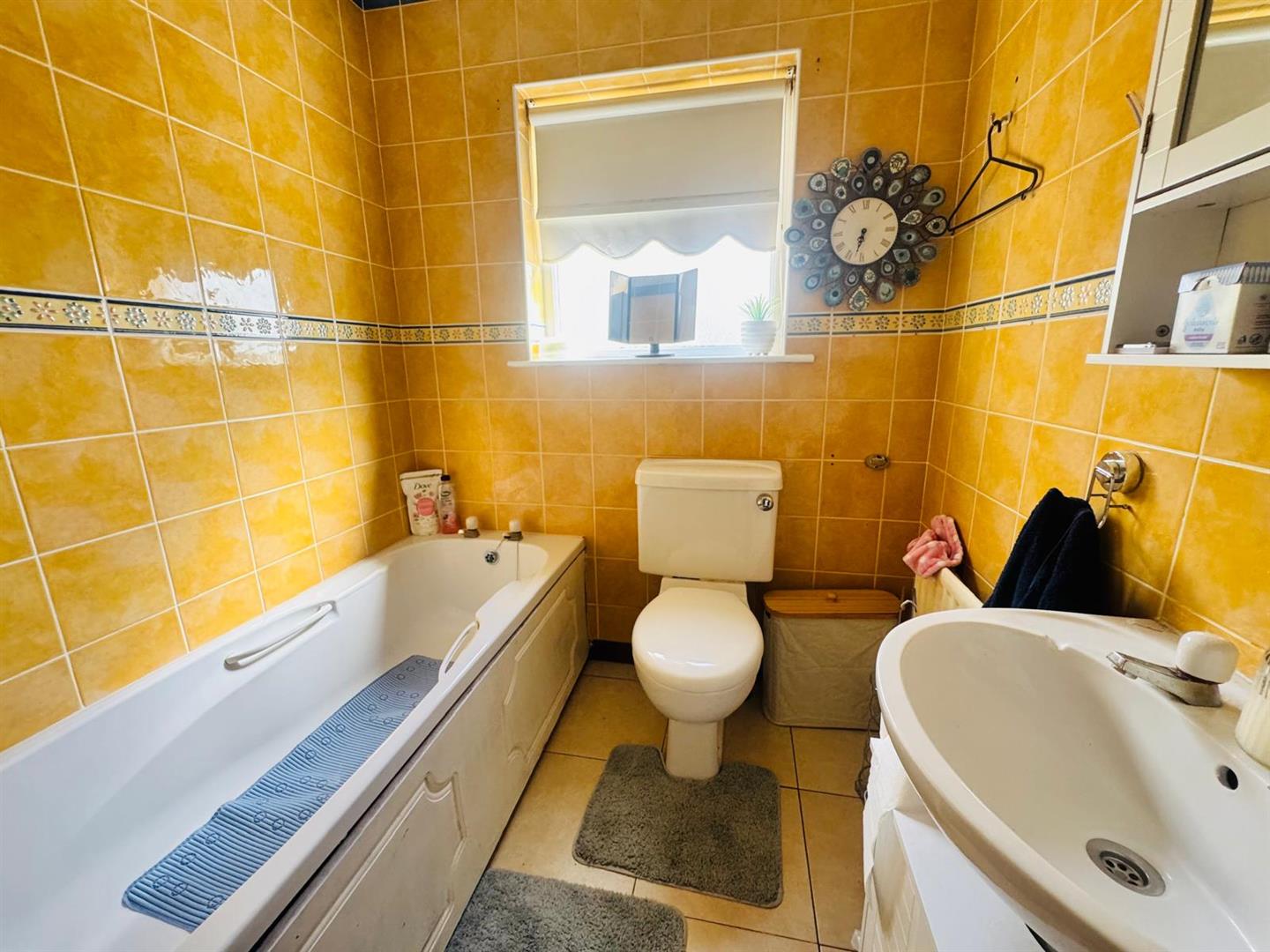 Comprising bath, whb and wc, fully tiled walk in shower, fully tiled walls and floor.
