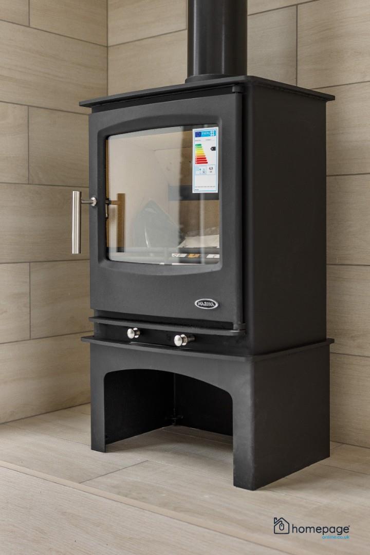 Feature wood burning stove to sunroom.