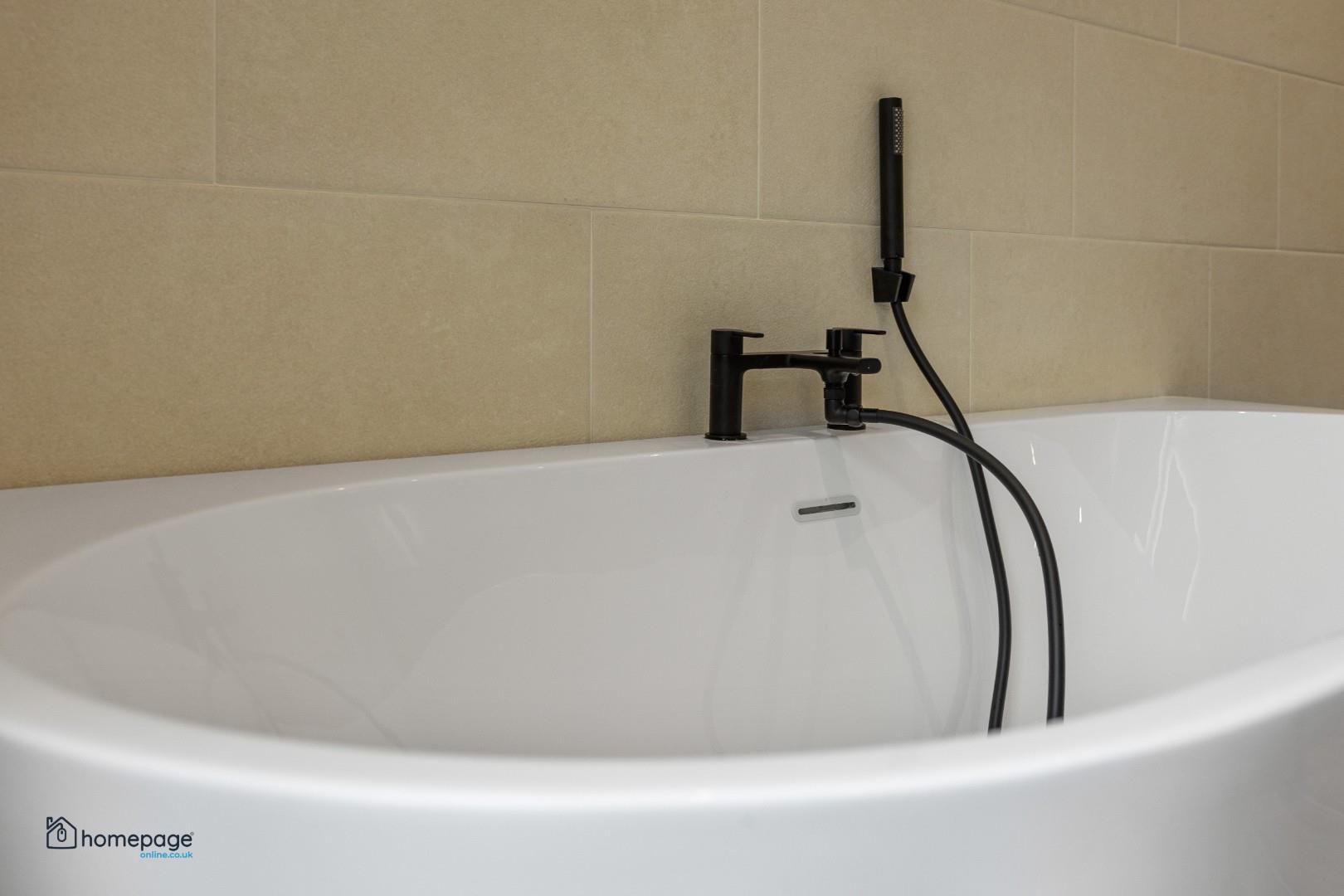 Thermostatically controlled free standing bath with black ironmongery.